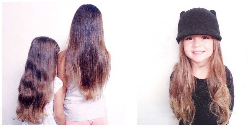 Vous savez quoi? les cheveux longs chez nous c’est histoire de famille… ou presque! J’ai moi même toujours eu les cheveux longs jusqu’à l’année dernière ( >> comme ici << ), approchant des 30 ans je me suis dit qu’il fallait « enfin » que je change de tête, mes filles ont toutes les 2 les cheveux long et ma petite soeur Chloé (photo 4) aussi. Alors dés qu’il s’agit de ciseaux, ici on s’affole! Enfin non, moi, plus, depuis  quelques temps. Mon petit mari chéri ayant (pas) très peu de cheveux, (non je ne suis pas marié à un vieux  rassurez vous! bien qu’il soit quand même vachement plus vieux que moi ;) ) les cheveux des ses filles sont devenus sa bataille ;) Il est interdit pour qui que ce soit de les couper, de s’en approcher même! Je suis la seule qui est le droit de les couper avec des ciseaux de cuisine, oui car les ciseaux de cuisine coupent beaucoup moins bien que des vrais ciseaux de coiffeuse, mais pas plus de 2 cm par mois, s’il vous plait, au risque qu’il me fasse une crise de nerfs, ou pire encore : une syncope! Avec la longueur que mes filles se trainent on me demande souvent, comment je fais pour les entretenir, mais surtout pour les coiffer le matin avant l’école. Maelle et Laura ne sont pas sensible des cheveux ou presque pas, il est très rare qu’elles se mettent à crier lorsque je les coiffe, (et pourtant je ne suis pas des plus douce), ou alors si, ça arrive quand je perd patience, ou quand Maelle se colle du chewgum dedans et croyez moi ça, ça arrive régulièrement. Ensuite, maintenant que Laura est grande, je lui demande de se passer un premier coup de brosse tous les matins et tous les soirs avant que je passe à la phase terminal : le démêlage intensif et la coiffure. J’ai demandé à Maelle il ni a pas longtemps de faire la même chose, de commencer à se démêler les cheveux toute seule, et à plusieurs reprise la brosse c’est trouvé emmêlé dans sa tignasse  au centre de sa tête! Un vrai calvaire! A noté : attendre 2-3 ans pour réitérer l’expérience. La petite dort souvent avec des tresses afin de faciliter le démêlage du matin mais aussi pour gagner un maximum de temps, car le matin, 1 minute c’est 1 minute! Et voilà, on vise pour 2016 la longueur de Raiponce! Souhaitez moi bon courage! Bises
