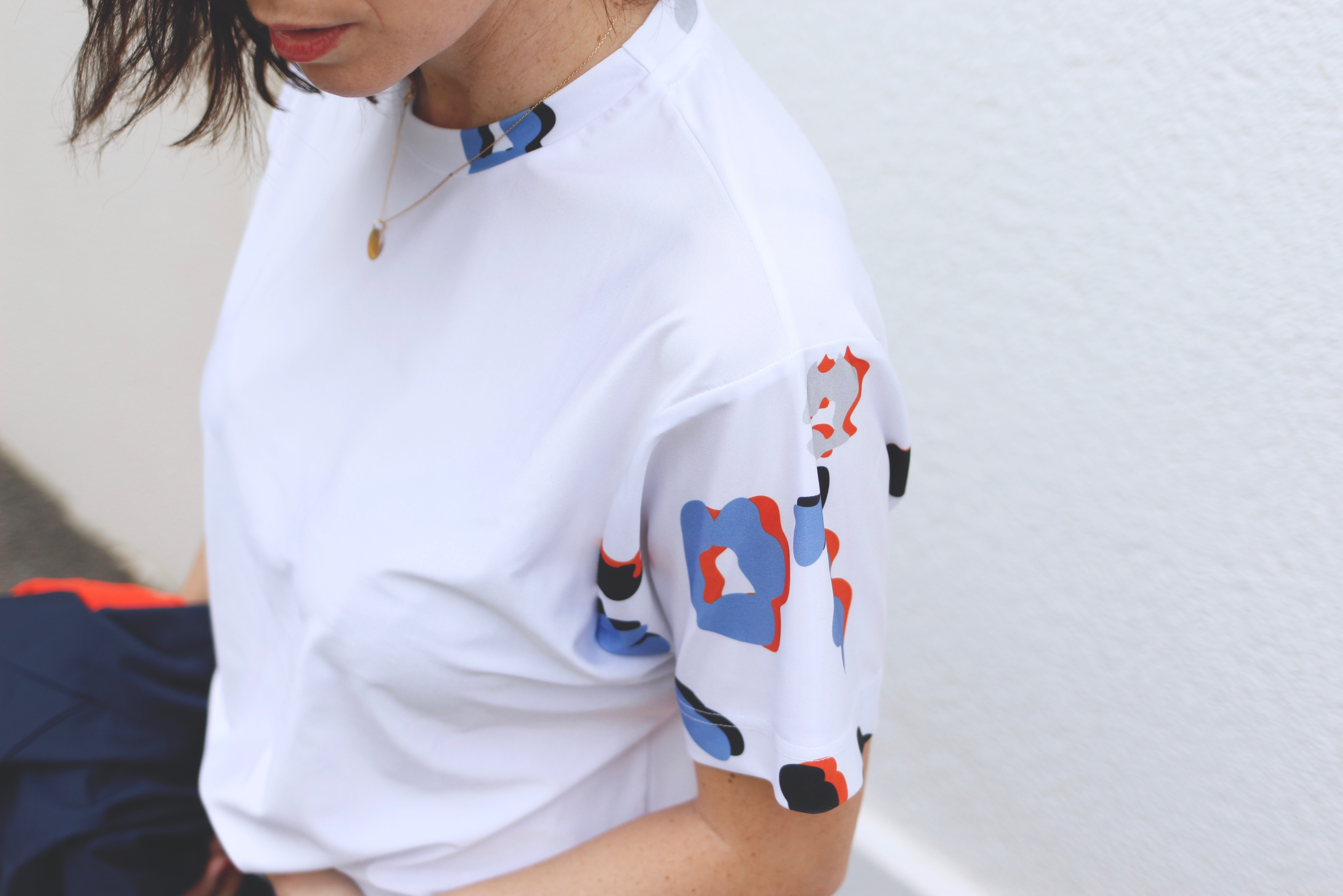 Nous avons été, toutes les 10, mises au défi de porter ce fameux tee-shirt blanc immaculé aux manches à motifs. À sa réception, il sentait bon la lessive (un vrai plaisir d’ouvrir le colis) et pour cause, notre tee-shirt avait subi le même sort que les autres!