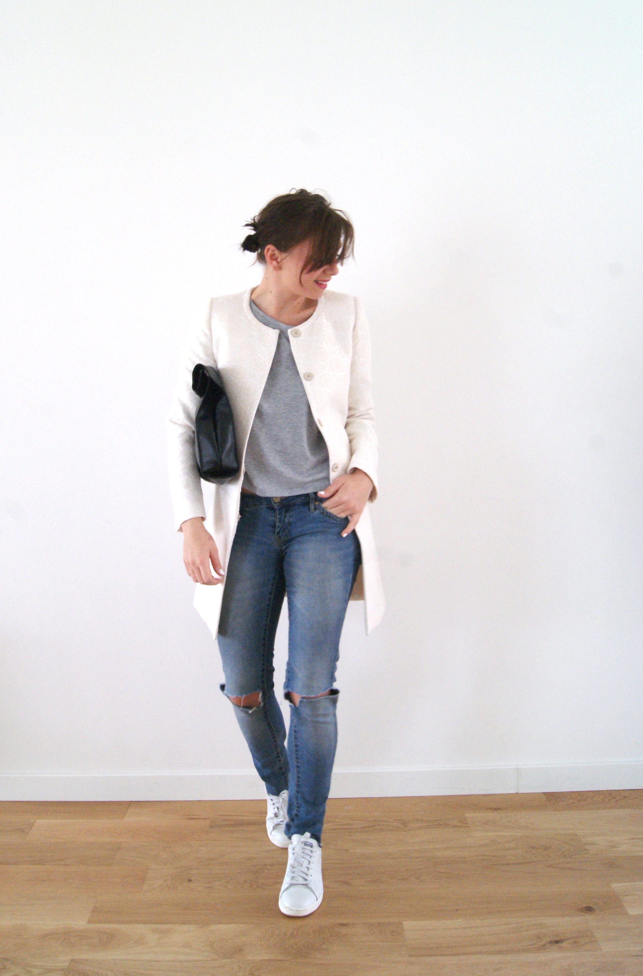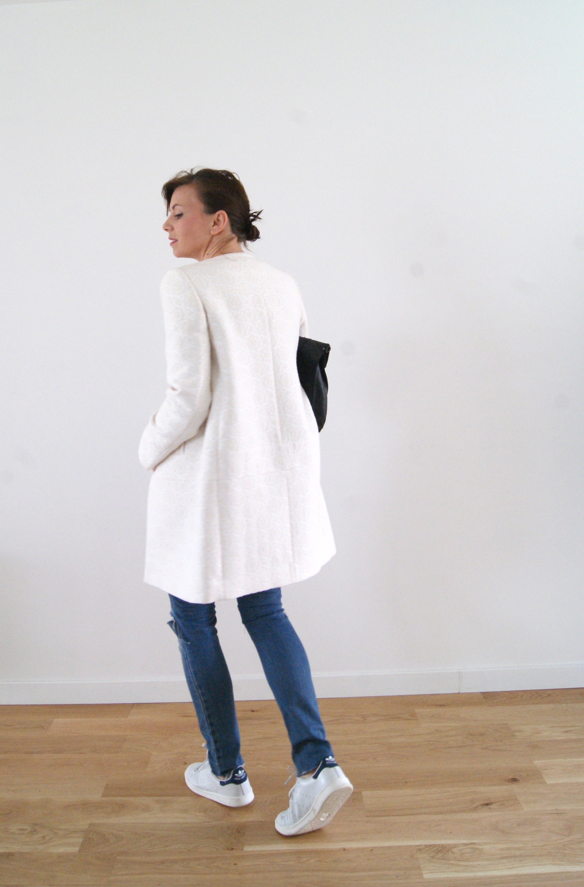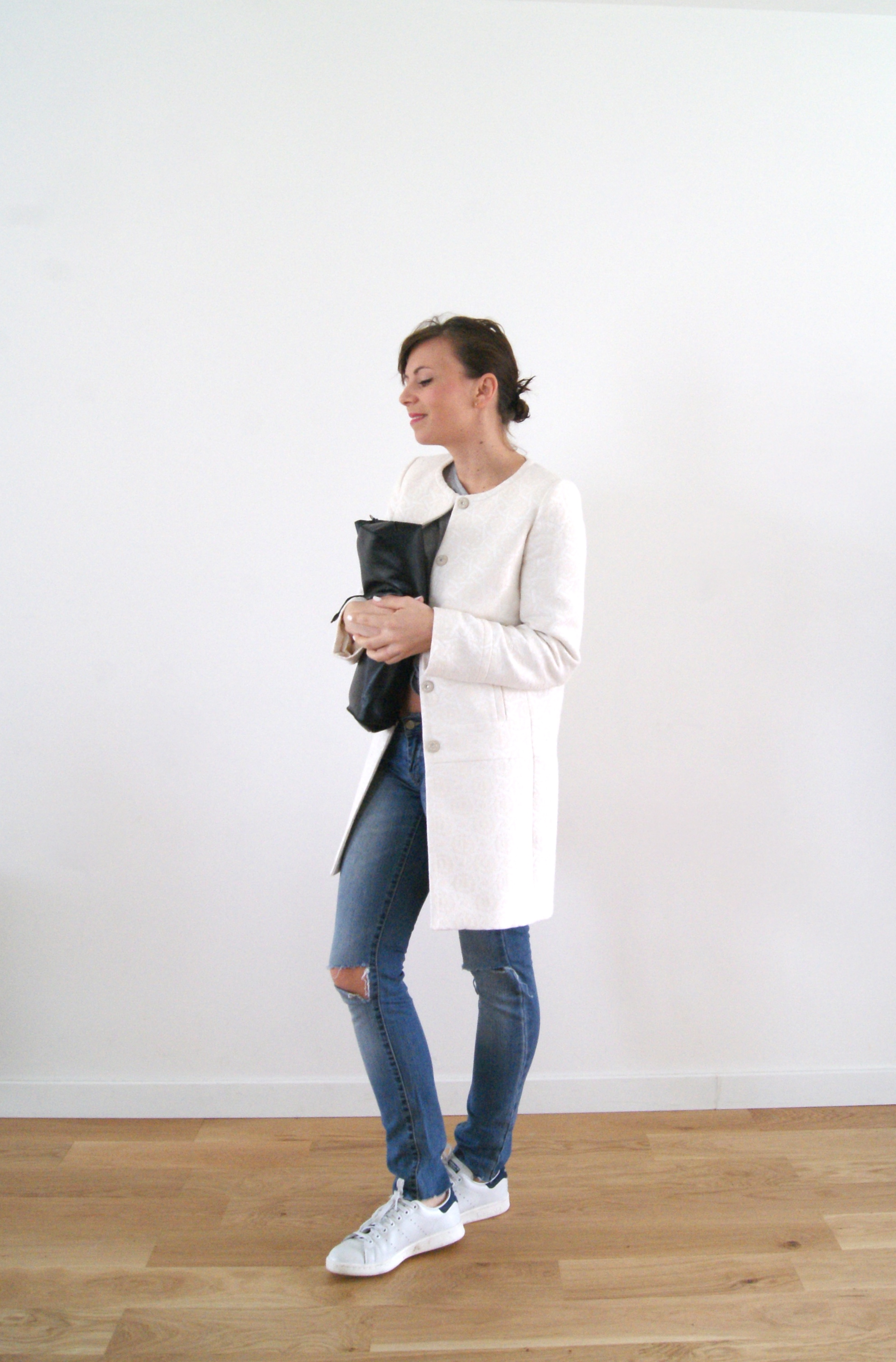 Très joli look. J’aime ces manteaux sans col. Pas très fan des Stan Smith habituellement, mais la manière dont tu les portes est juste parfaite.