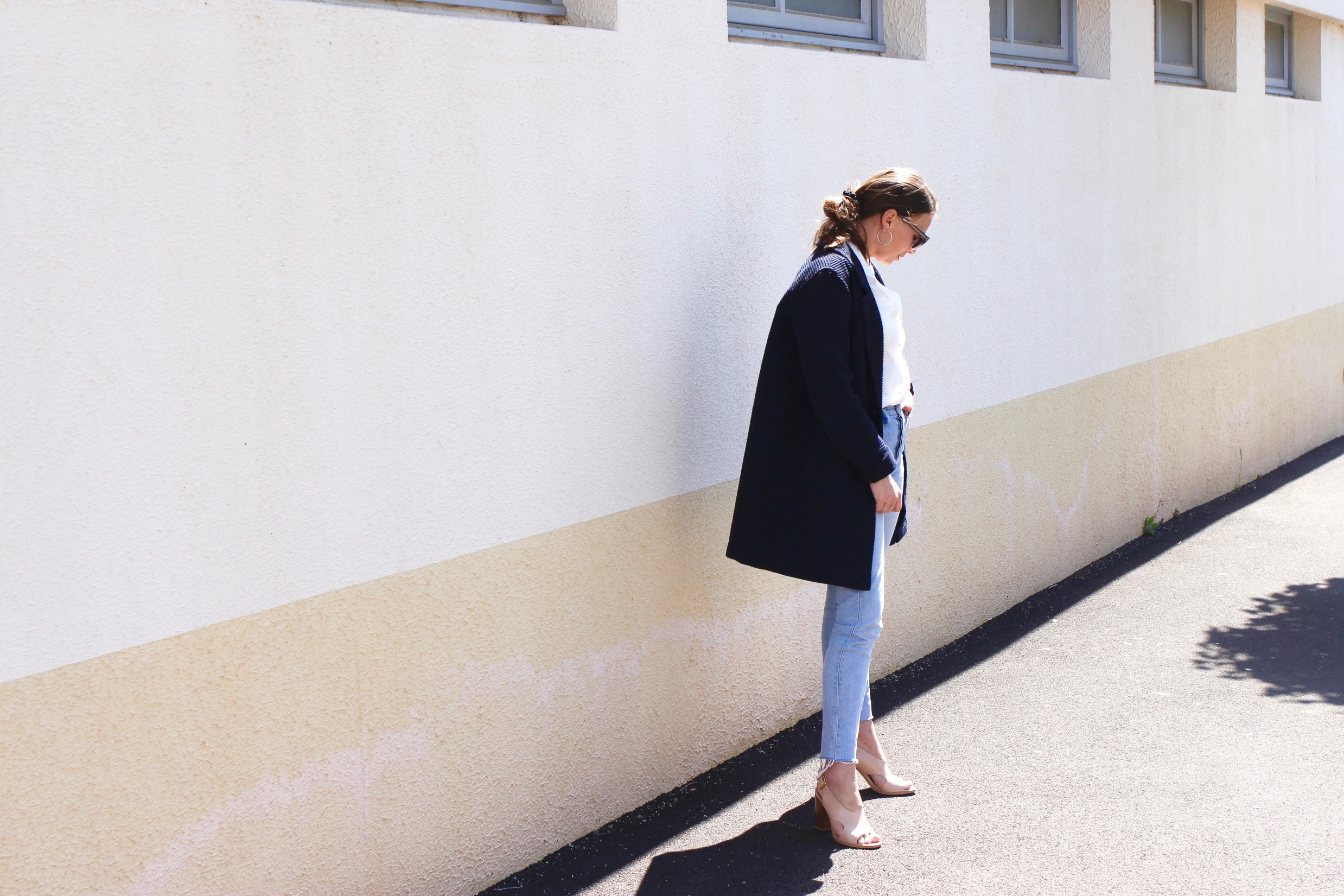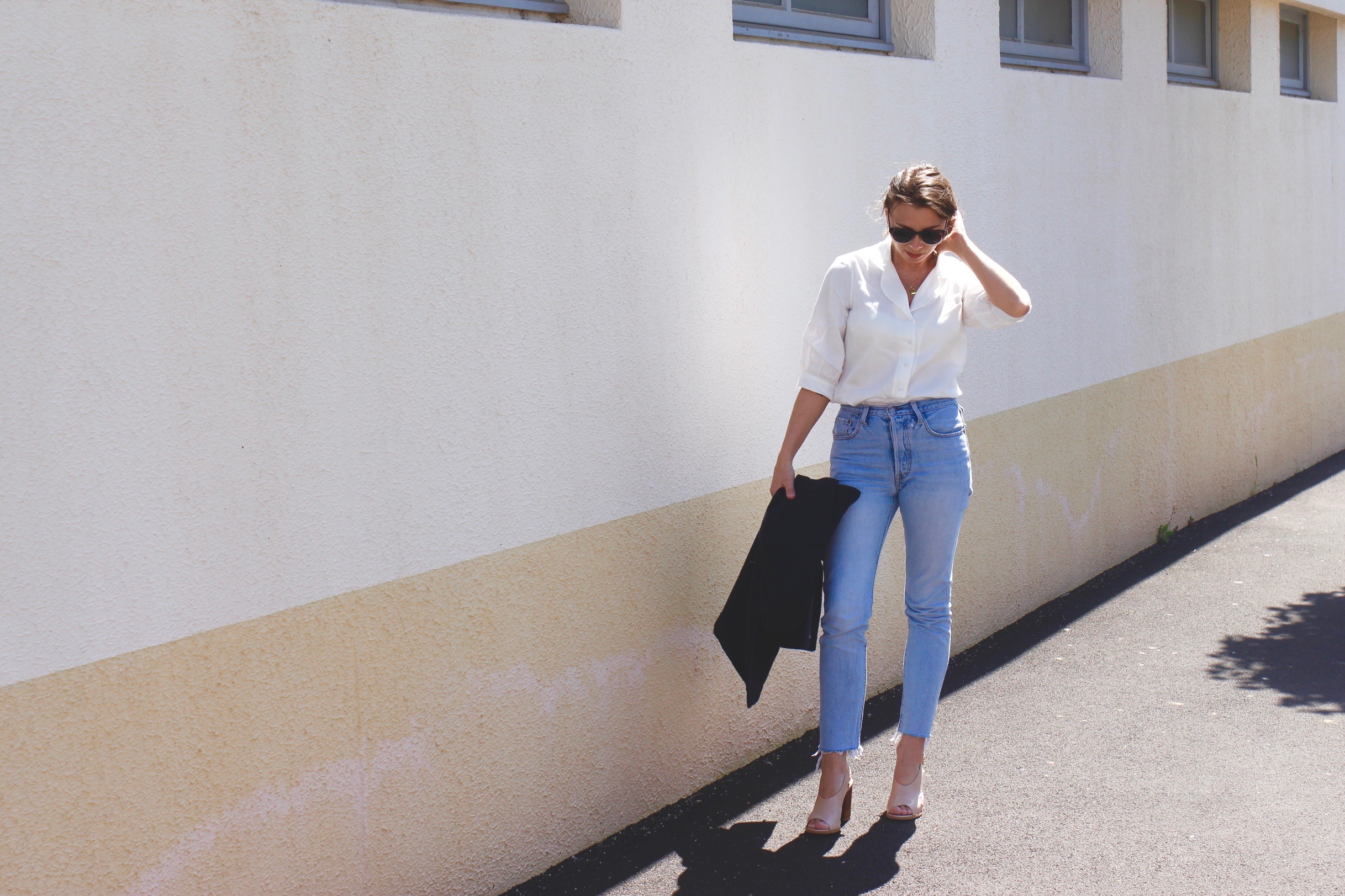 Je ne suis pas surprise de la qualité de celle-ci, la matière est agréable et les détails impeccables, c’est un vrai plaisir de la porter. J’ai d’ailleurs envoyer un mail aux filles 1P10S en leur disant que si la chemise était reconduite dans un coupe « droite/basique » et loose je craquerais sur-le-champ tellement que celle-ci est jolie. Coté look pour ma part et comme beaucoup j’ai opté pour le jean. Chemise blanche + jean, oui c’est facile mais c’est aussi généralement toujours réussi ;) une paire de sandale nude, et une longue veste bleu marine pour un total look casual et féminin.