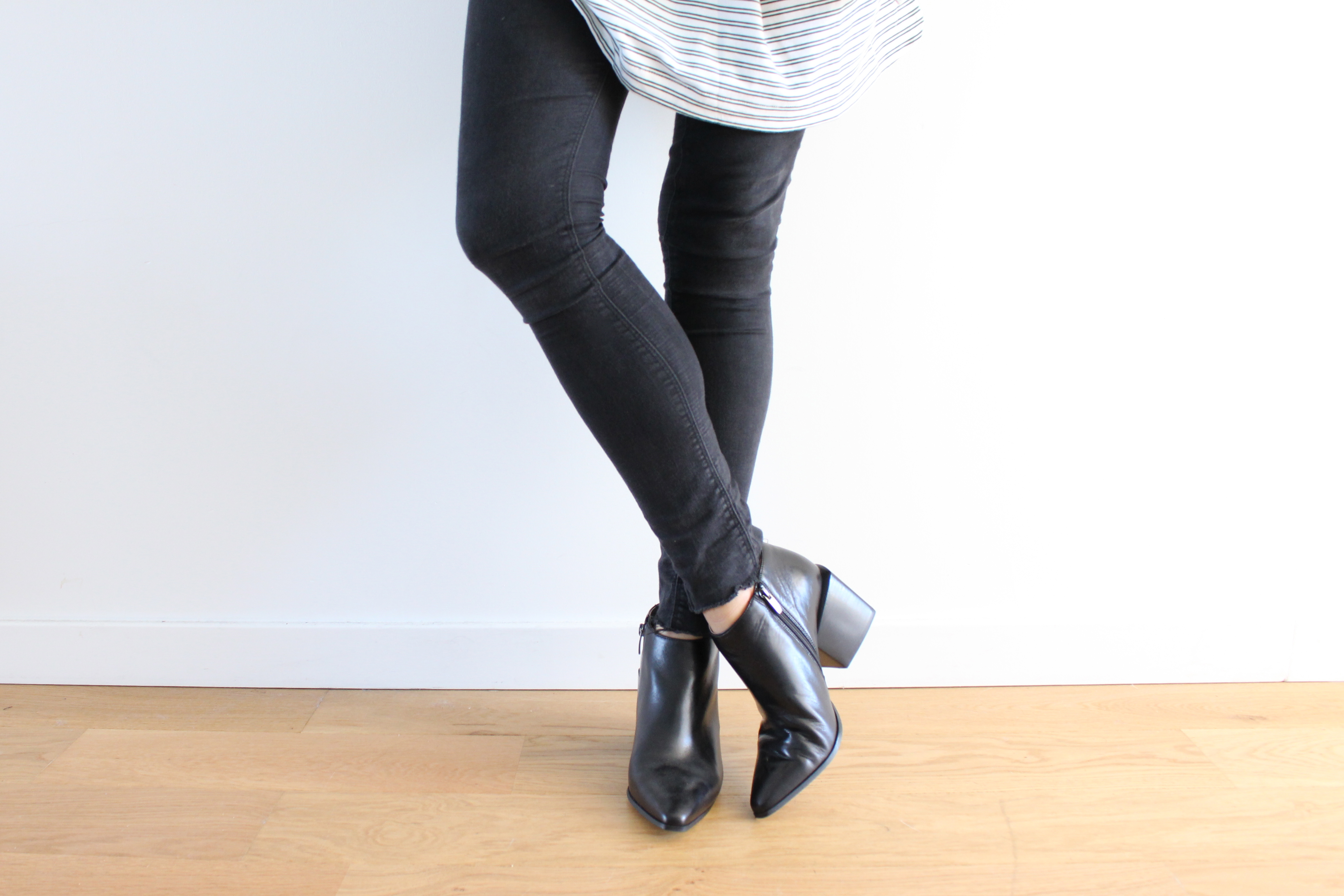 On retrouve comme pièce commune à la team des bottines à gros talons, au bout pointue qui les rend chic, un talon large pour pouvoir trotter toute une journée. J’ai donc décidé d’y associer une robe que je porte en tee-shirt XL, un skinny noir, et (encore) une veste boyfriend en jean que, j’aime beaucoup. Une tenue que j’adore et dans laquelle je me sens bien!