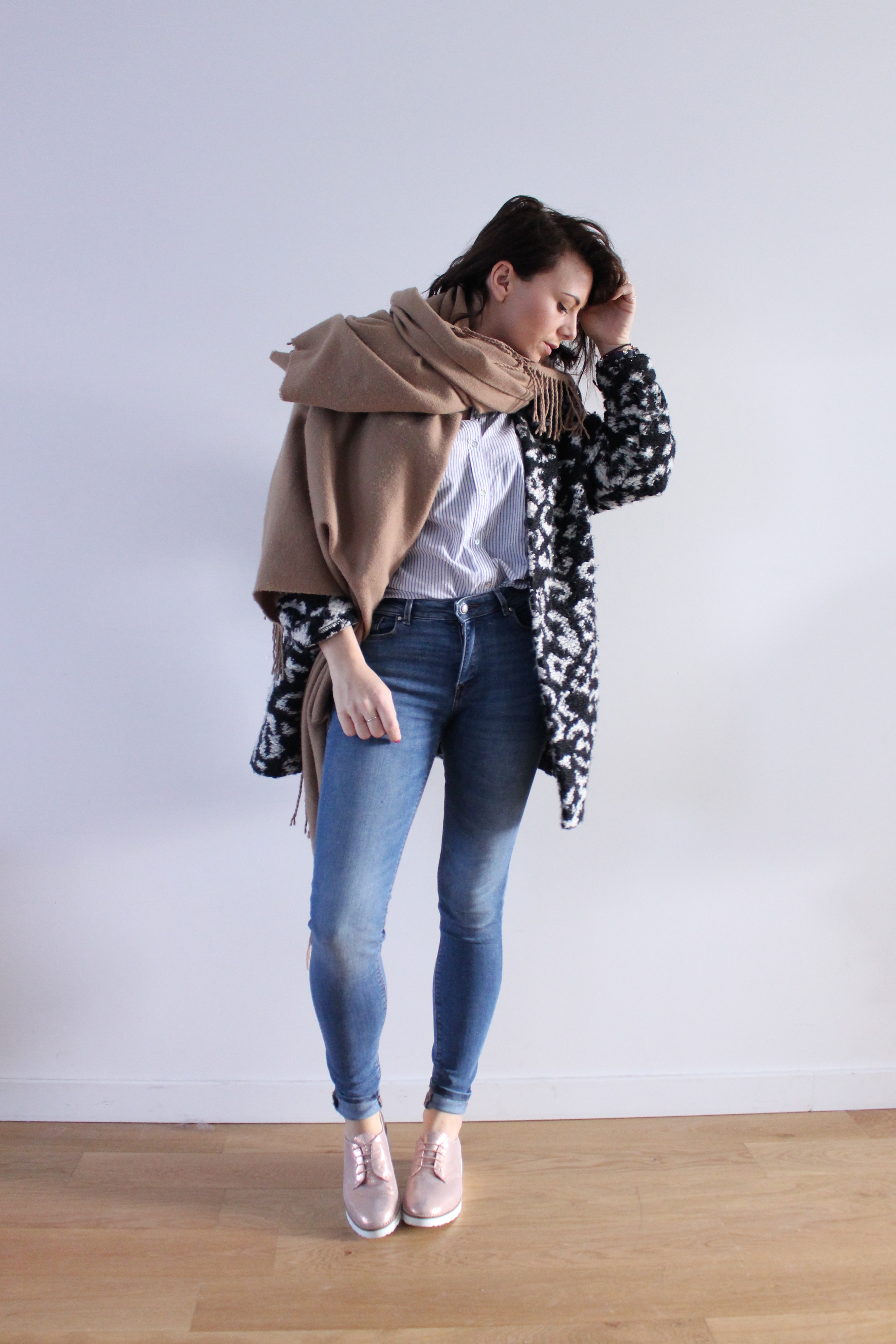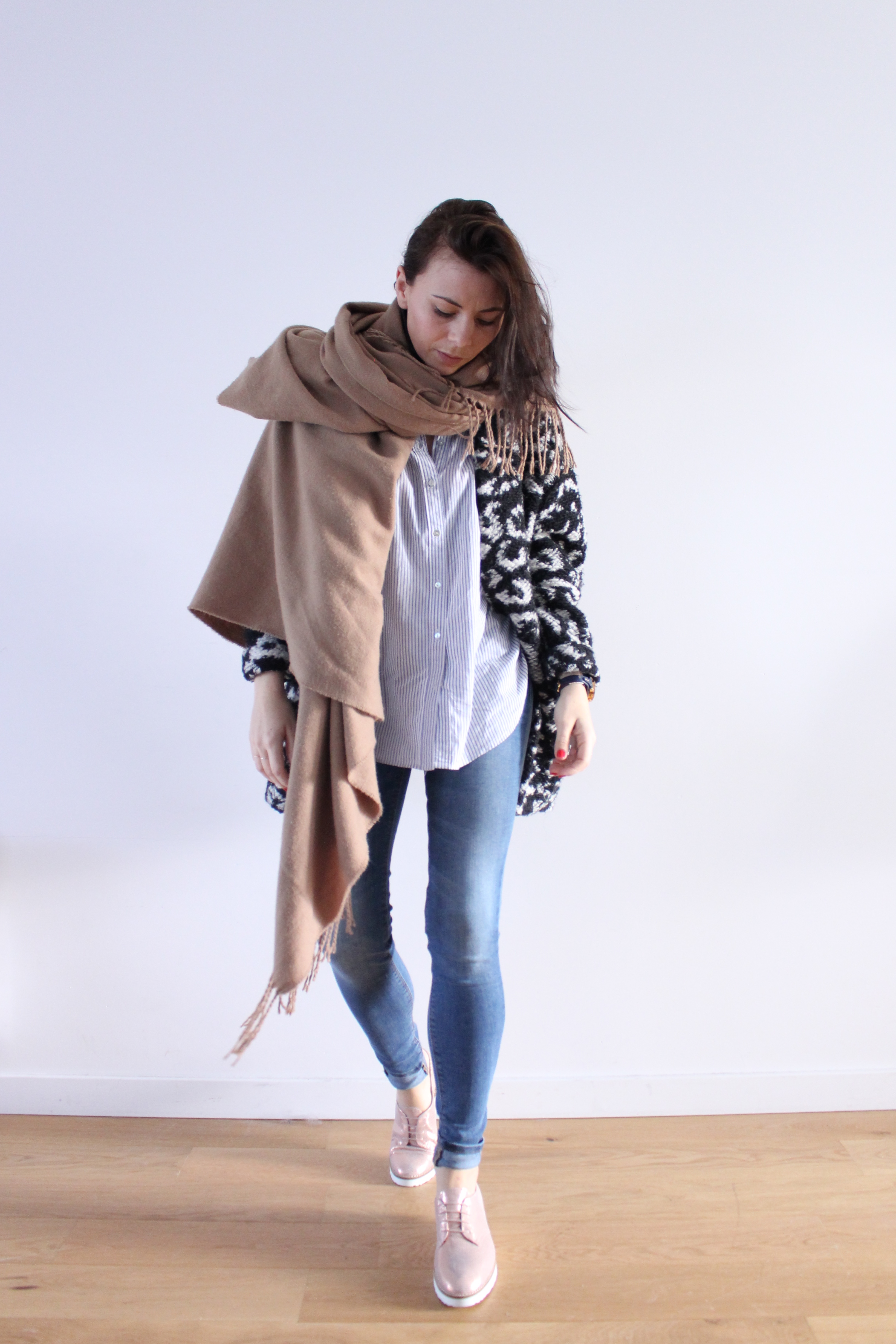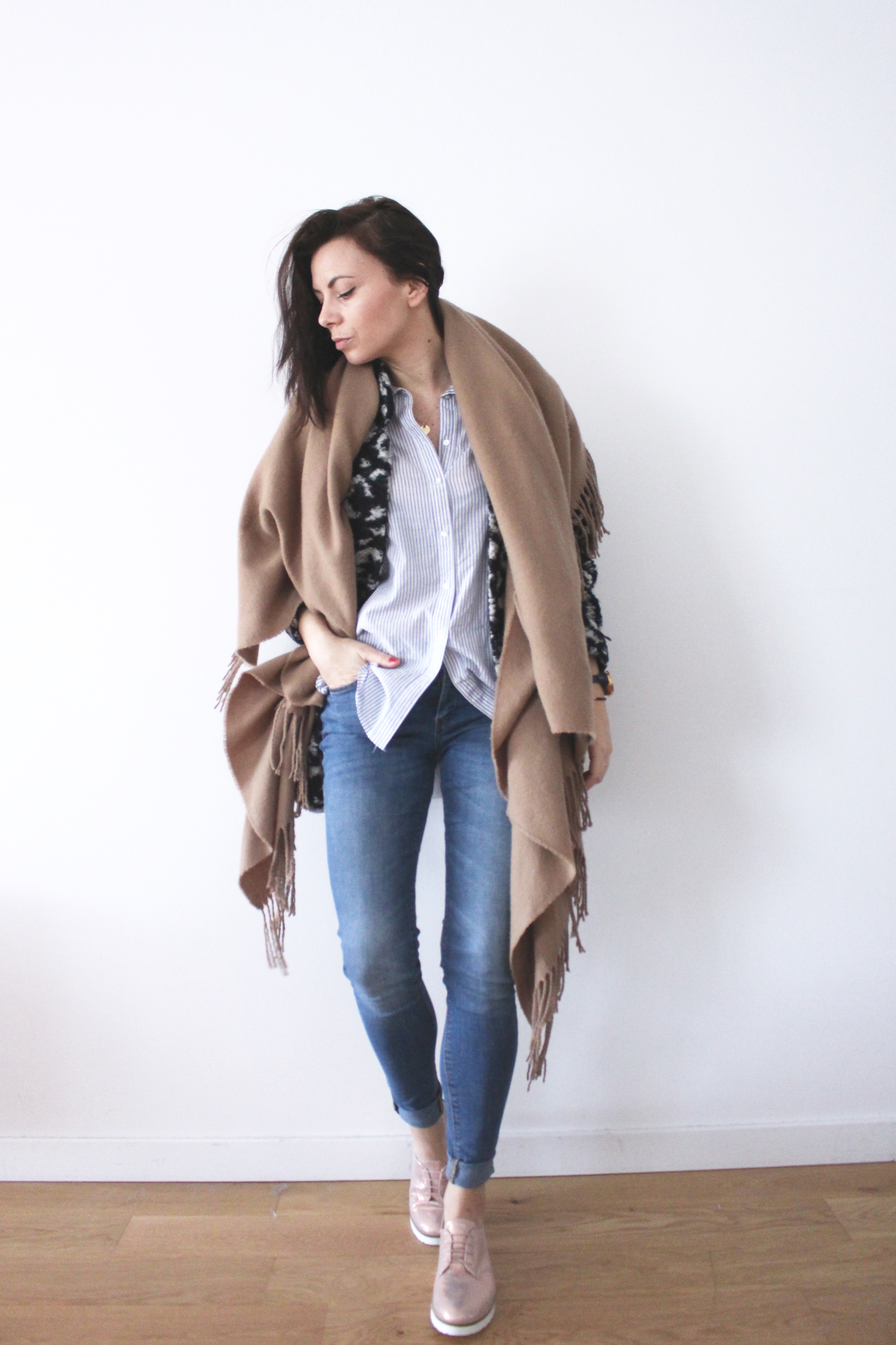 Cette fois ci j’ai opté pour un jean skinny, une chemise boyfriend, une veste en laine, et une grosse écharpe poncho, j’ai d’ailleurs hésité à enfiler une paire de chaussette! Ça sera pour la prochaine fois. :)