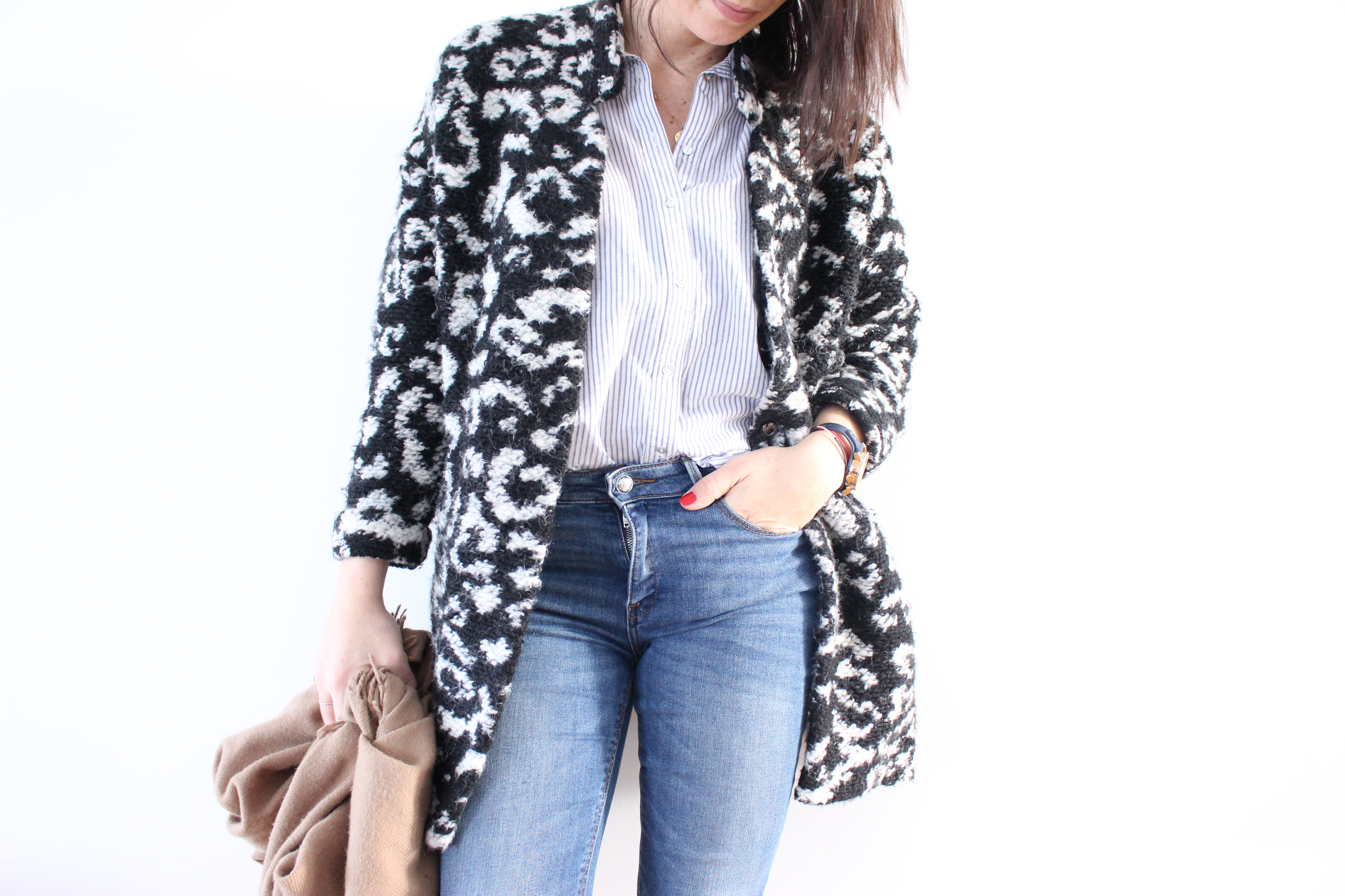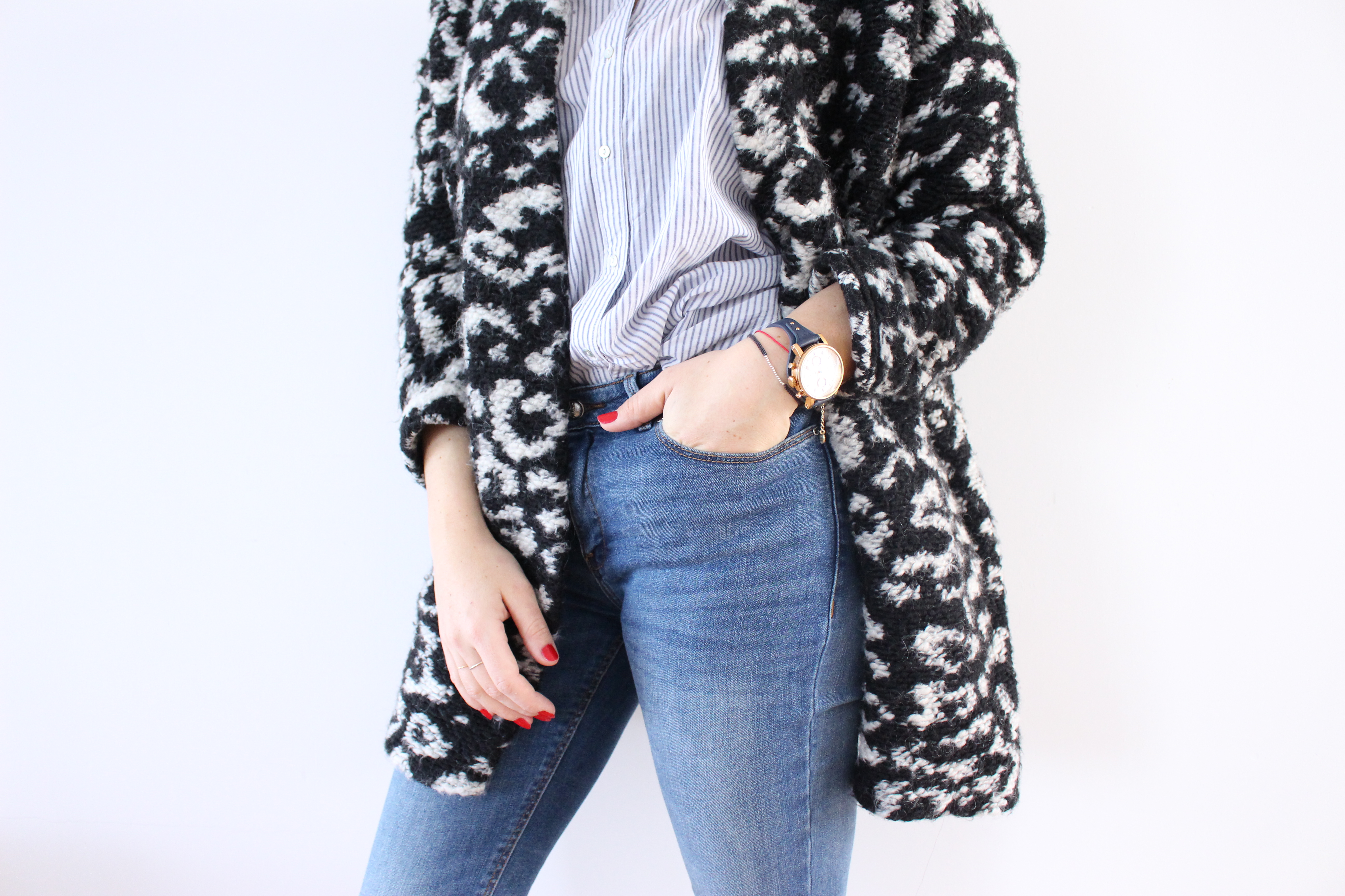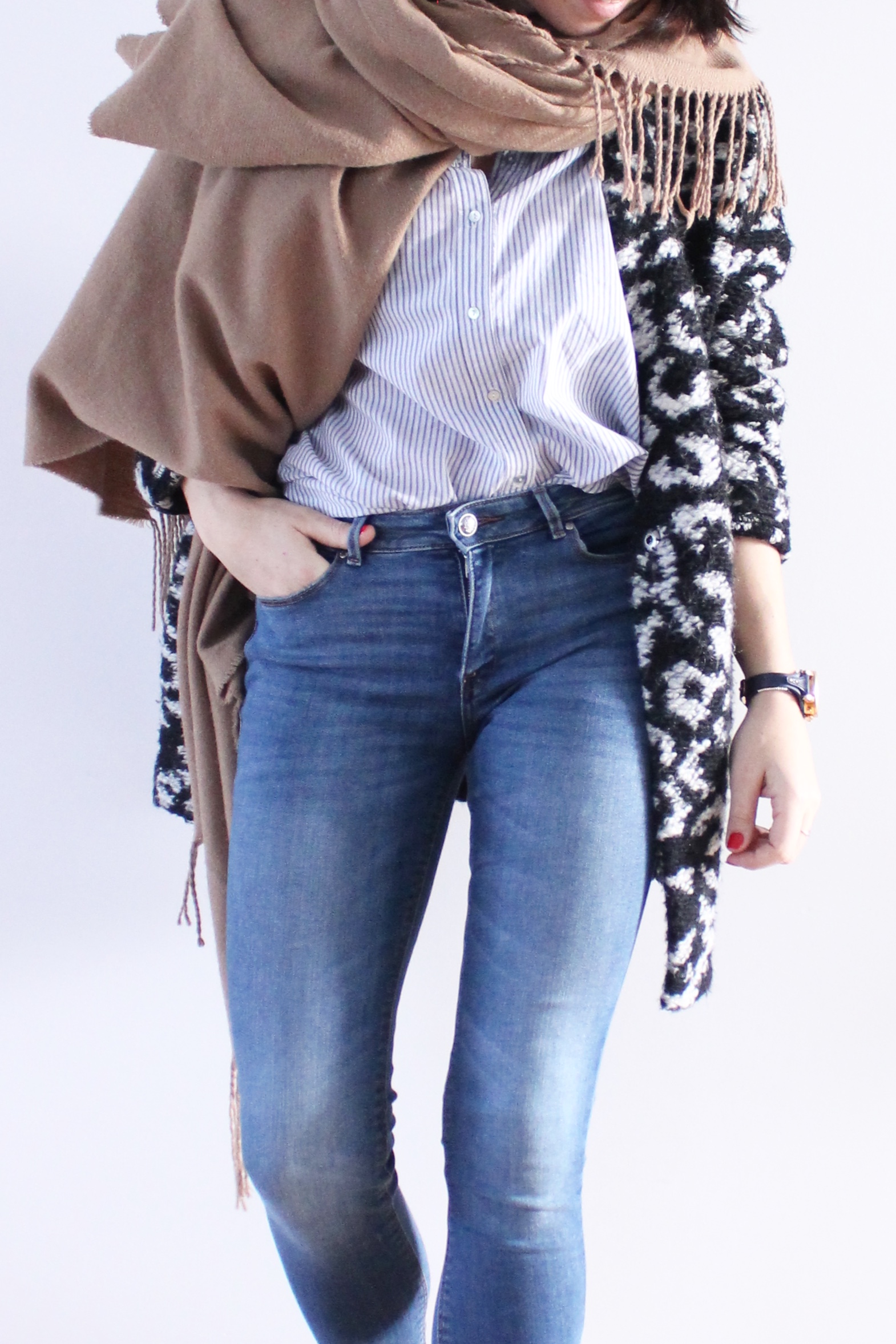 Cette fois ci j’ai opté pour un jean skinny, une chemise boyfriend, une veste en laine, et une grosse écharpe poncho, j’ai d’ailleurs hésité à enfiler une paire de chaussette! Ça sera pour la prochaine fois. :)