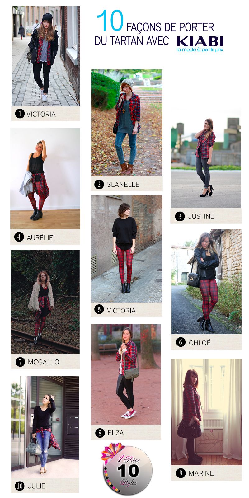 Oh yeah! Alors ce mois c’est l’anniversaire de notre team, nous fêtons avec vous les 2 ans d’Une Pièce 10 Styles! C’est pas cool sérieux? Nous vous donnons donc RDV également le 23 pour une prochaine édition et le 30 sur la page >> FaceBook de la team << pour un week-end surprenant. Aujourd’hui c’est la jolie Victoria de V-ntage qui nous rejoint, et c’est une grande enseigne avec une tendance trop cool qui collabore avec nous. KIABI met à l’honneur le tartan, et vous fait découvrir 10 façons de porter ces fameux carreaux. Un legging et une chemise au choix, moi je décide de porter les 2 en même temps pour une look « grungy » à petits prix! Vous pouvez retrouvez toute l’actu de Kiabi sur le Mag et le Blog qui vous donnera pleins de conseils et d’astuces pour s’approprier les pièces tendances de de la marque. Sur ce je vous dis à demain, bisous bisous.