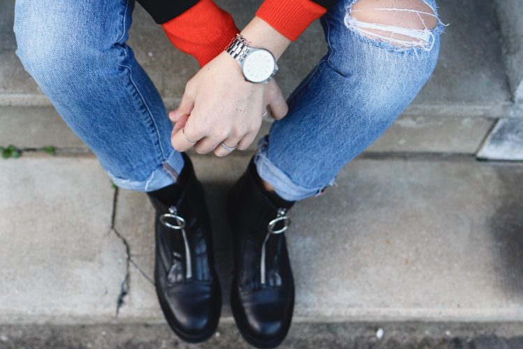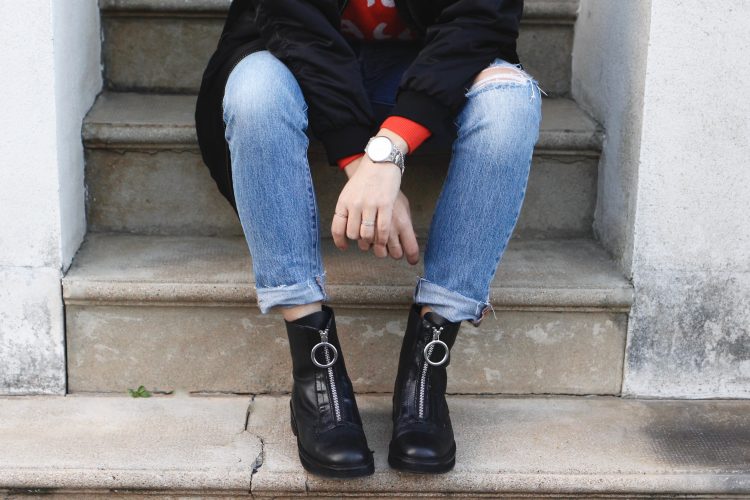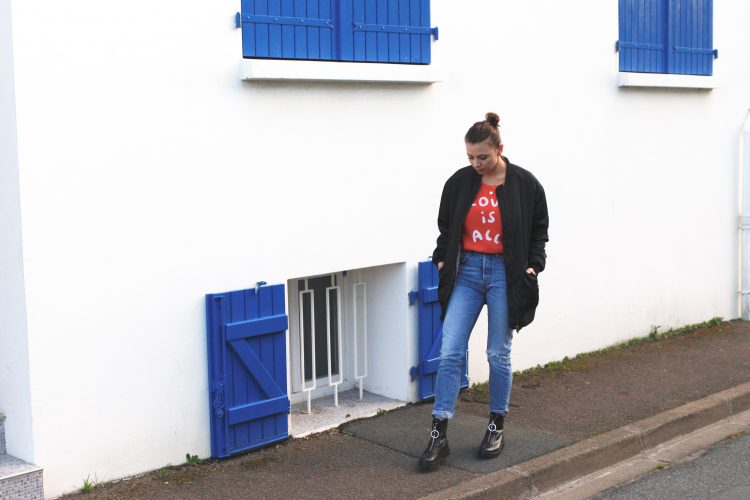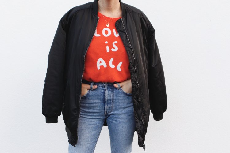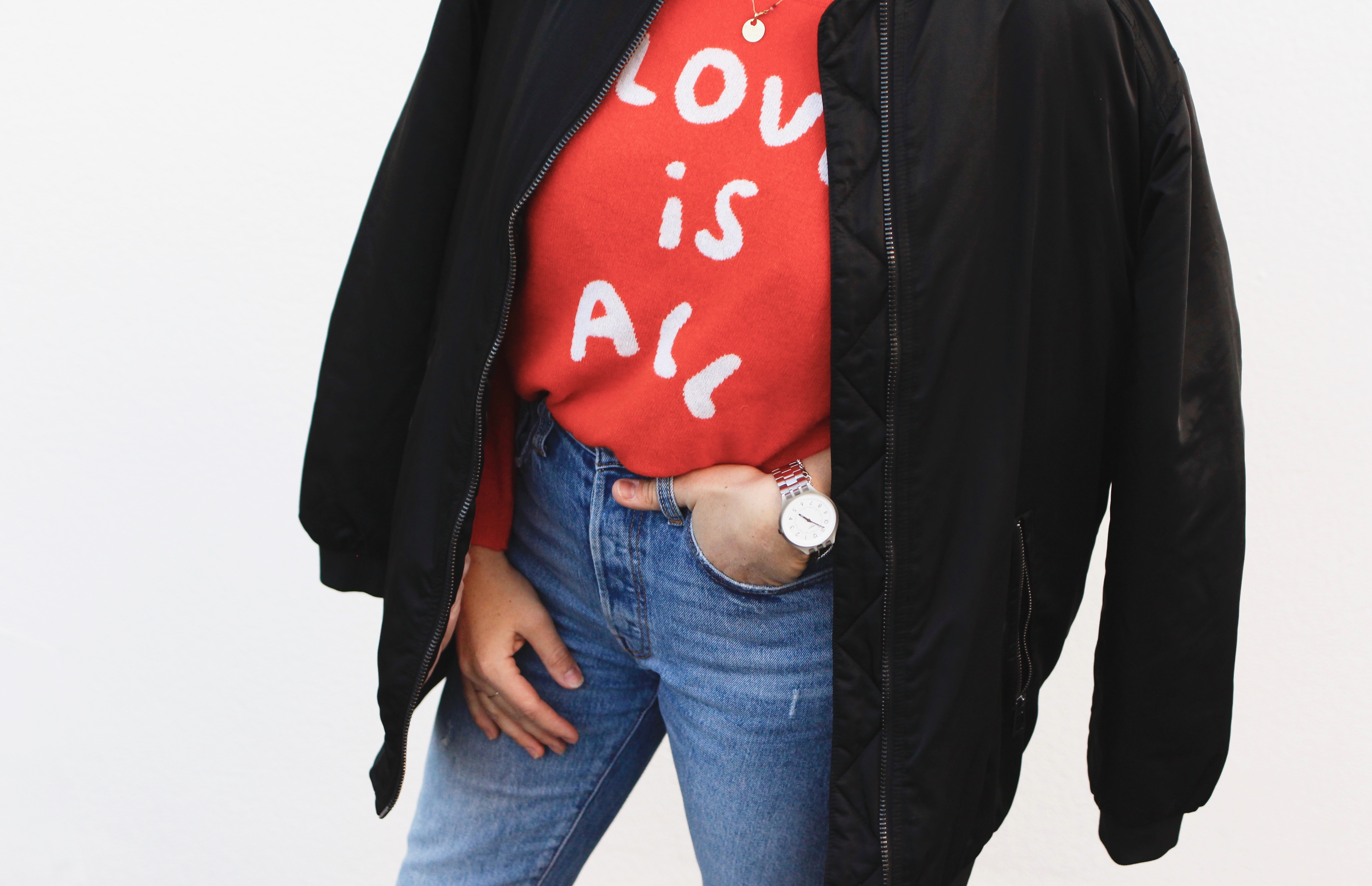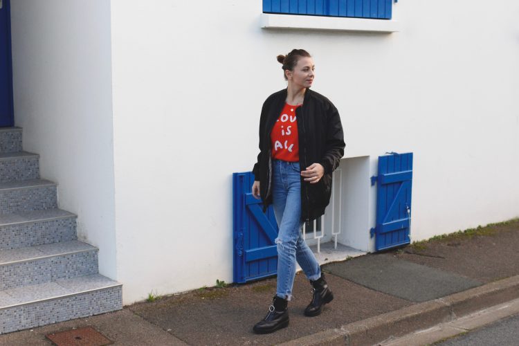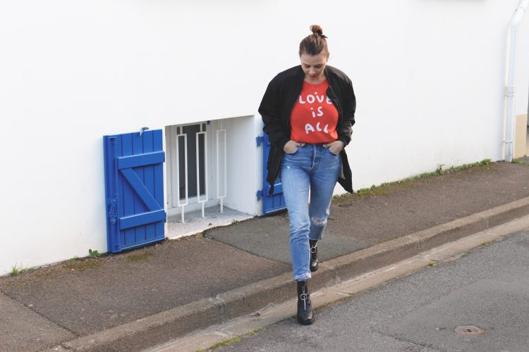 Pour relever le défi j’ai opté pour des pièces basiques de mon dressing (en même temps j’avoue n’avoir que ça !) un jean, un long bomber noir et une paire de bottines à fermetures pour donner à ce pull au message plein d’amour « Love Is All » un coté plus rock and roll !