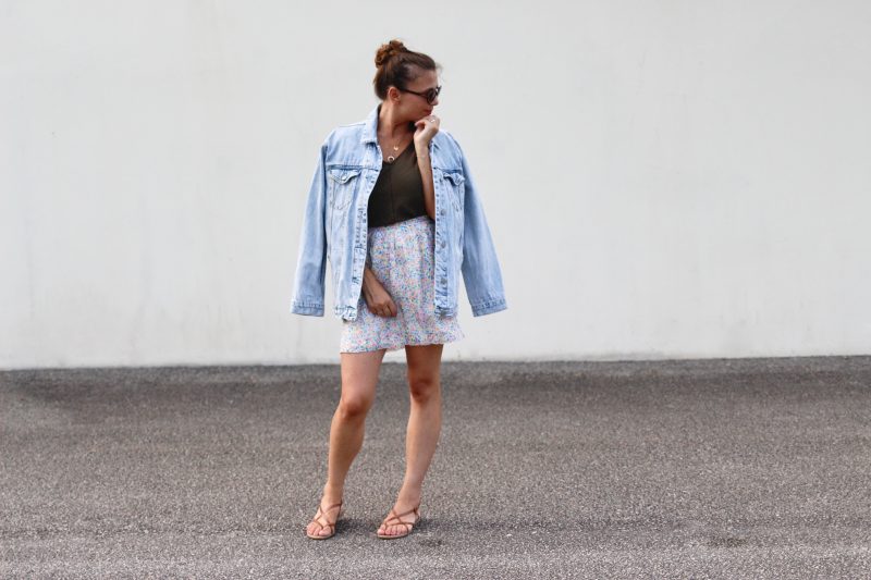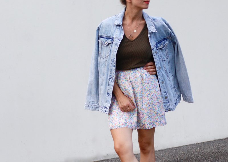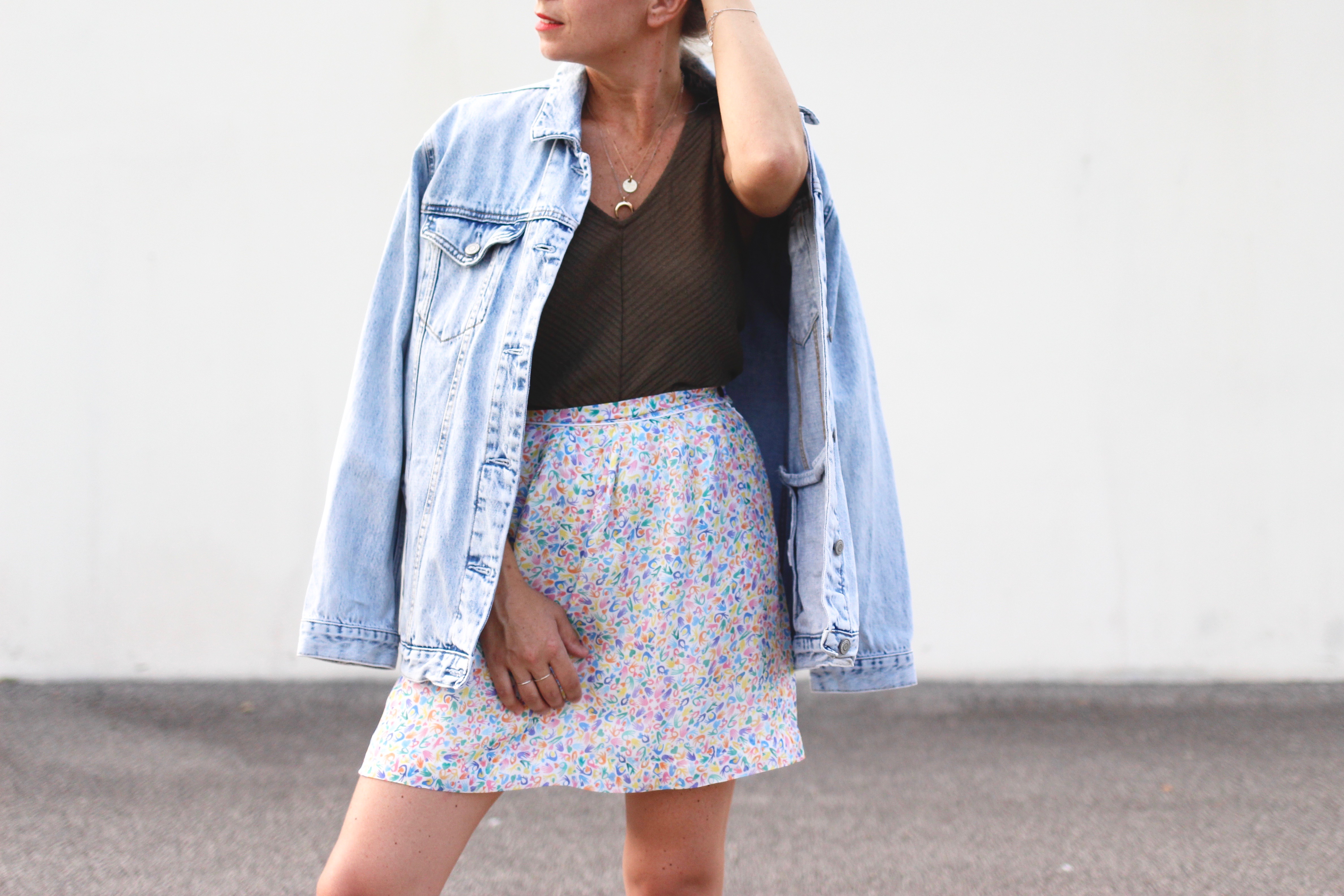 La jupe est en 100% soie, en mousseline très légère et vaporeuse. Une coupe facile à porter à laquelle j’associe un débardeur kaki et une veste en jean loose et une paire de lunettes rondes.