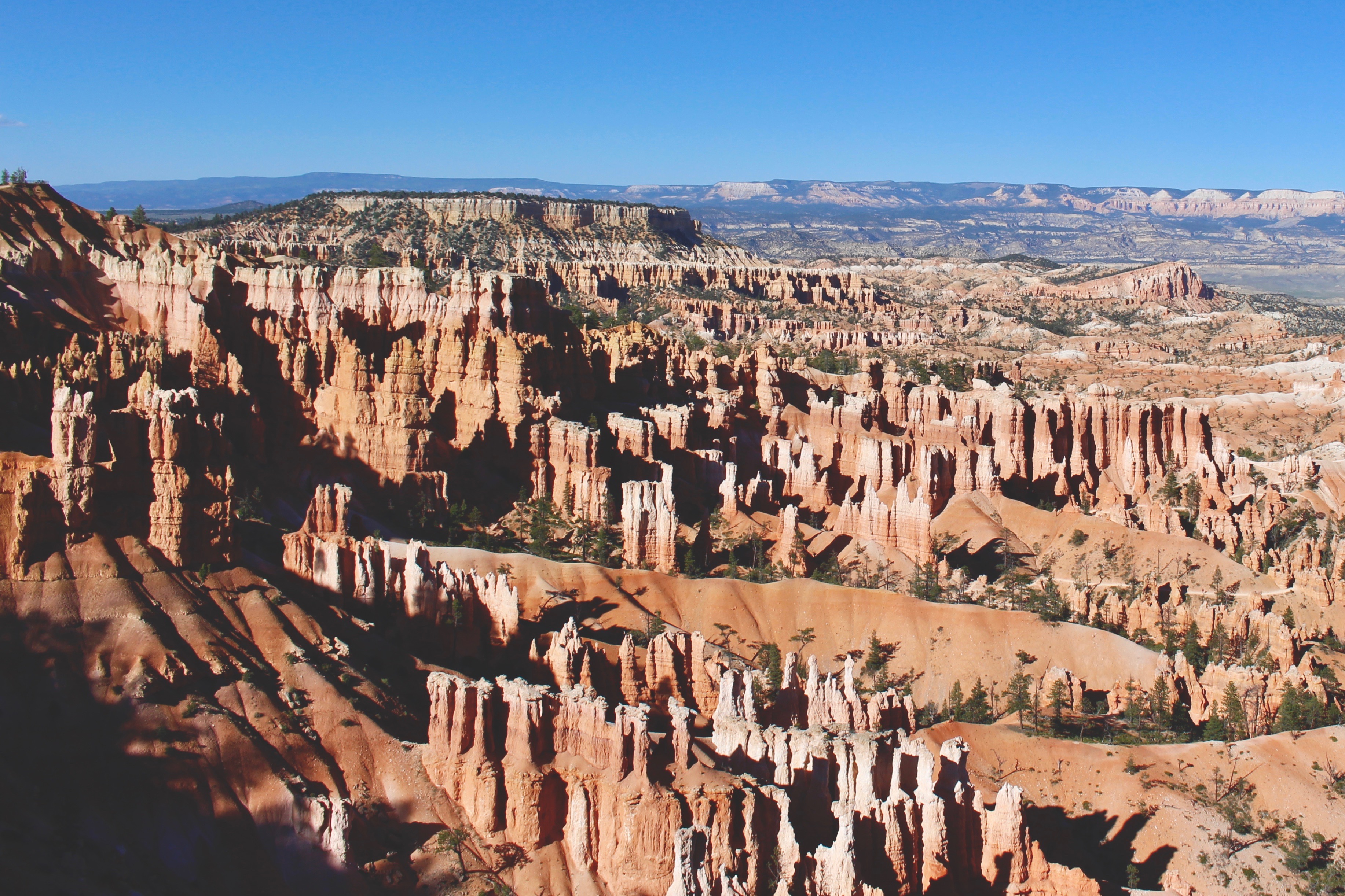 Je n’ai pas beaucoup de photos, étant donné que la batterie de mon appareil photos m’a lâchement lâchée pendant notre périple du jour, autant vous dire que j’étais bien triste car pour le coup nous en avons pris pleins les yeux. Bryce Canyon est bien plus qu’un Canyon, c’est un amphithéâtre ! La pluie et la neige ont sculptés les fameux hoodoos en calcaire rouge et blanc.