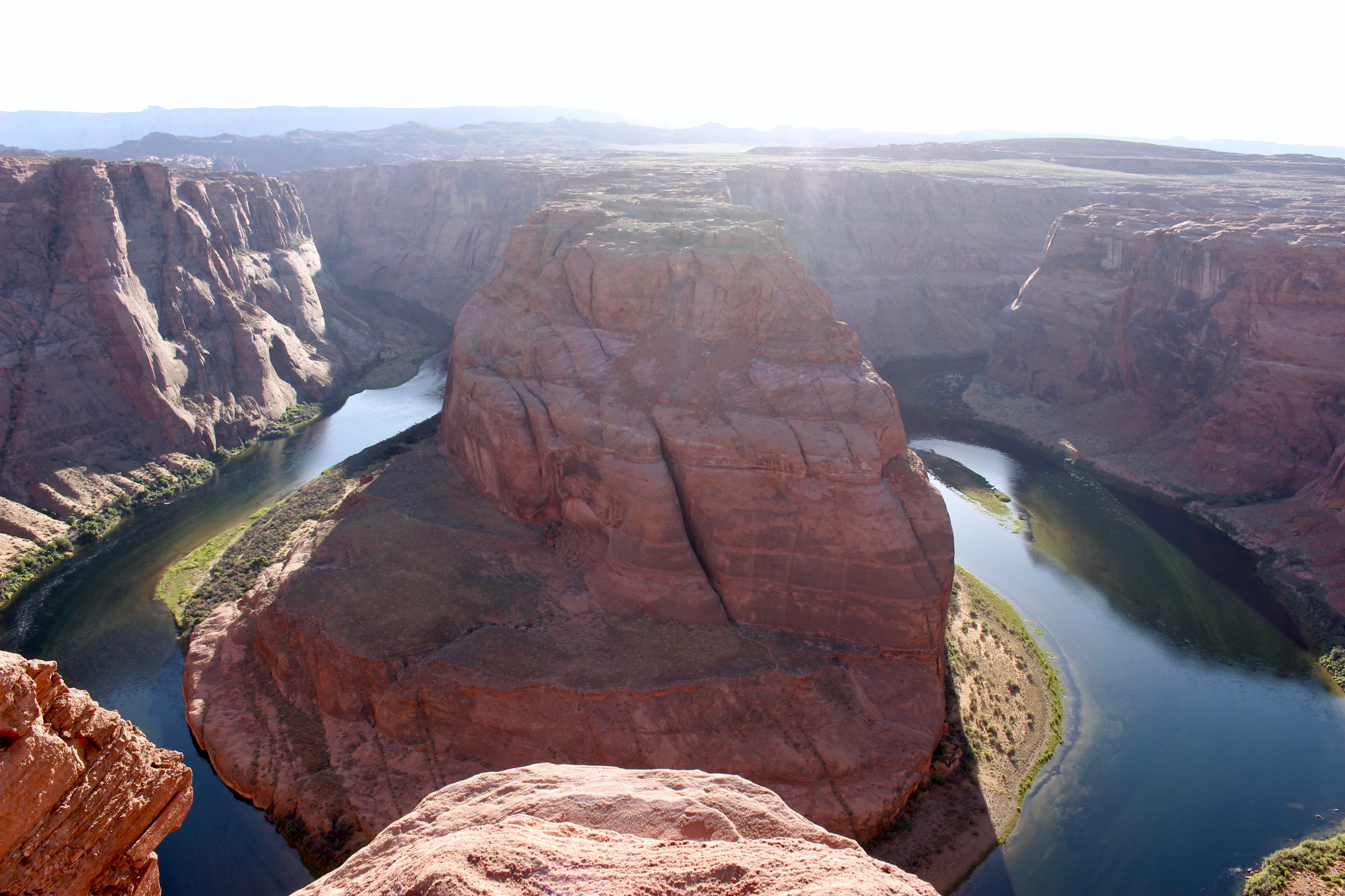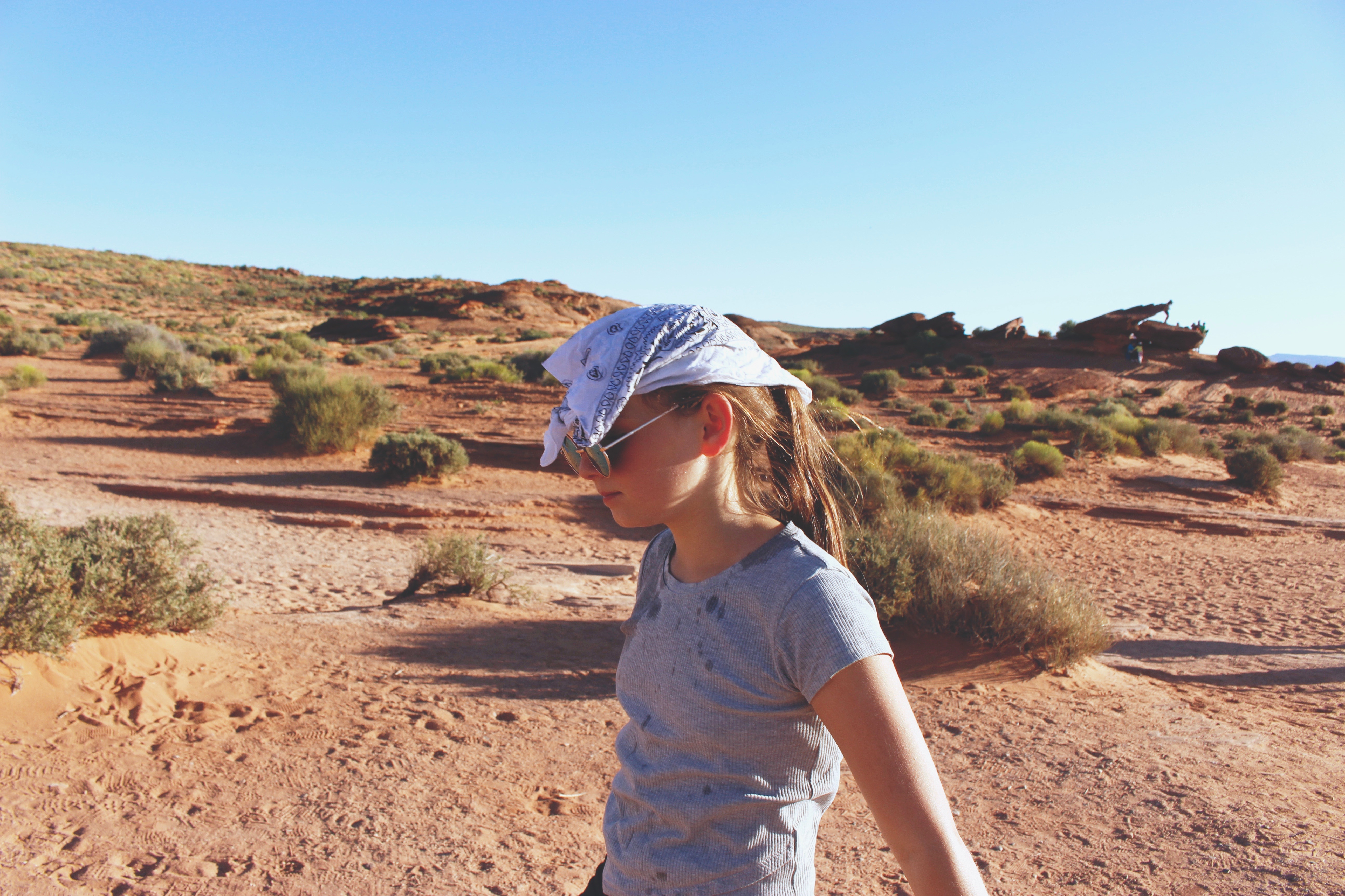 Même si la chaleur est très lourde et la marche un peu longue, tout du moins pour les enfants, clairement la marche en vaut la chandelle: cet endroit est considéré comme l’une des plus belles merveilles de la région ! Du haut cette immense falaise, moi qui est le vertige autant vous dire que je ne me suis pas trop approchée, nous pouvons observer le fleuve du Colorado aux eaux vertes, qui vient encercler un gigantesque roche de grès rouge. Wouaaaah ! (C’est la nature qui a fait ça ? Oui, je me suis encore fait cette reflexion ;))
