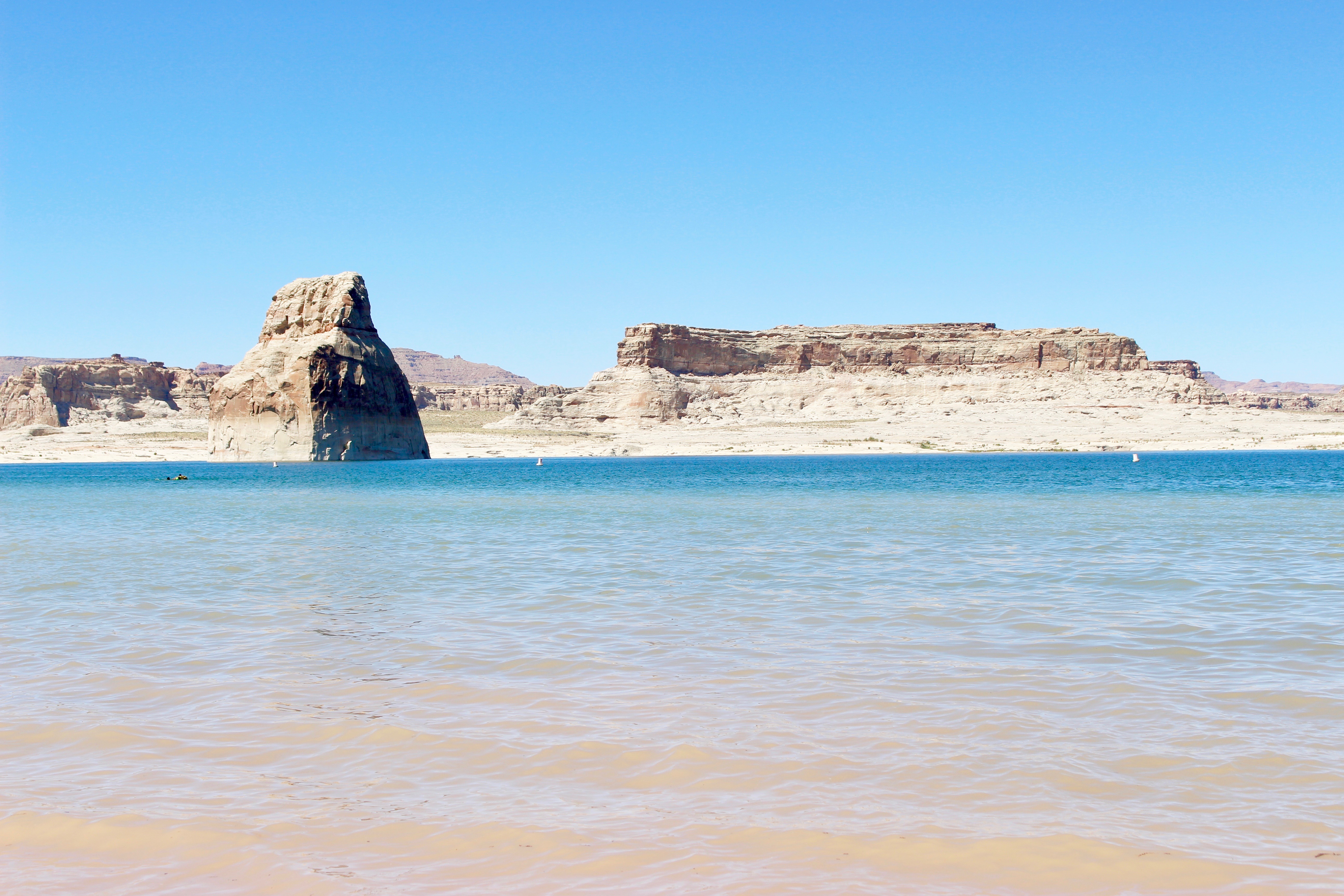 Le lendemain, après avoir eu une mauvaise surprise quand aux prix des visites de Lower et Antelope Canyon, comptez 38 dollars par personnes en pleines saison, pour une visite d’1 heure / 1 heure 30, blindée de touristes. Il est vrai que le lieu est vraiment unique dans son genre : un canyon à ciel ouvert avec ses roches creusées par vent et le sable à la verticale, je vous invite à aller découvrir quelques photos sur internet, vous pourrez ainsi facilement imaginer la beauté de ce canyon lisse. Encore une fois pour une question de budget nous avons décidé de nous poser au lac Powell pour nous baigner. Nous nous sommes arrêtés à Lane Rock, pour profiter de sa petite plage de sables fins tout en admirant cette massive formation rocheuse au milieu de l’eau. En arrivant à Lane Rock faites attention à ne pas vous enliser, le 4×4 est fortement recommandé sur les terres indienne, on sait maintenant pourquoi.