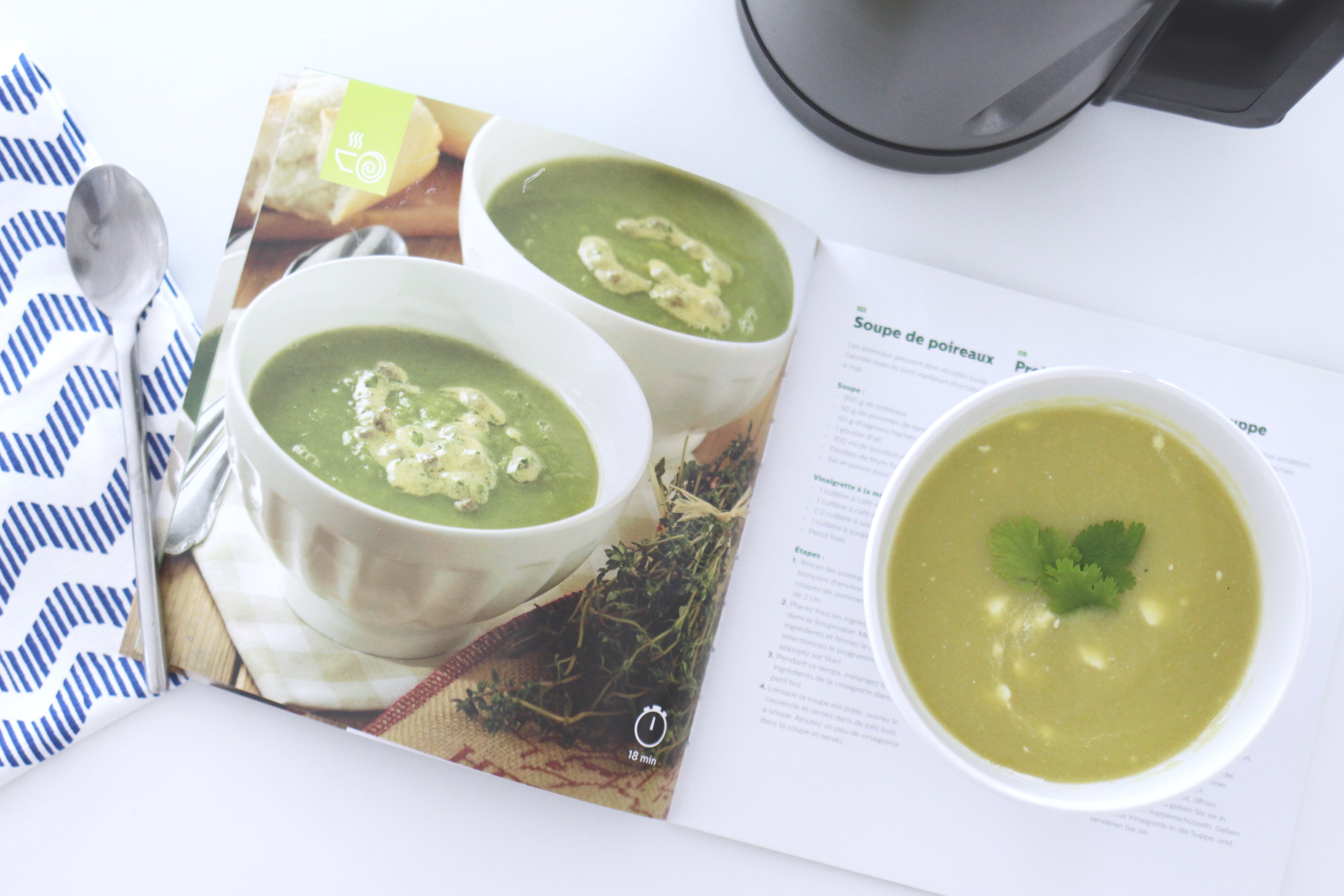 J’ai toujours un bon paquet de légumes dans mon frigo, brocolis, courgettes, poireaux, tomates… j’étais donc équipée pour créer ma toute première soupe! J’ai demandé à Maelle celle qui lui ferait plaisir dans le livre de recette (oui, pour la première j’ai voulu suivre une recette à la lettre, histoire de me familiariser avec la machine et de ne pas faire de bêtises quand à la quantité/contenant) nous nous sommes donc arrêtées sur une recette de soupe aux poireaux (si vous avez vu cette vidéo, vous savez sans doute que les poireaux à la maison on aime ça! ;))