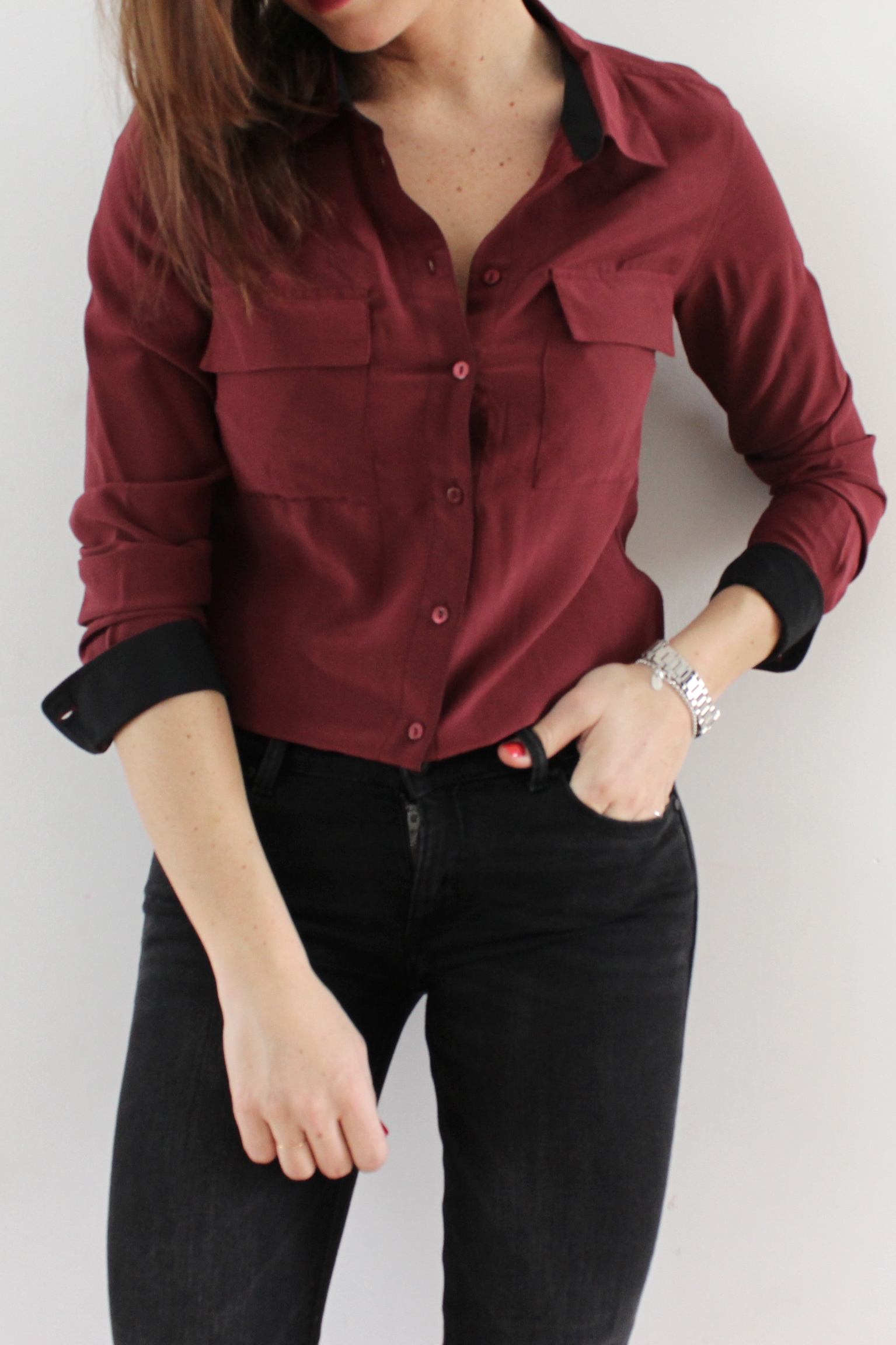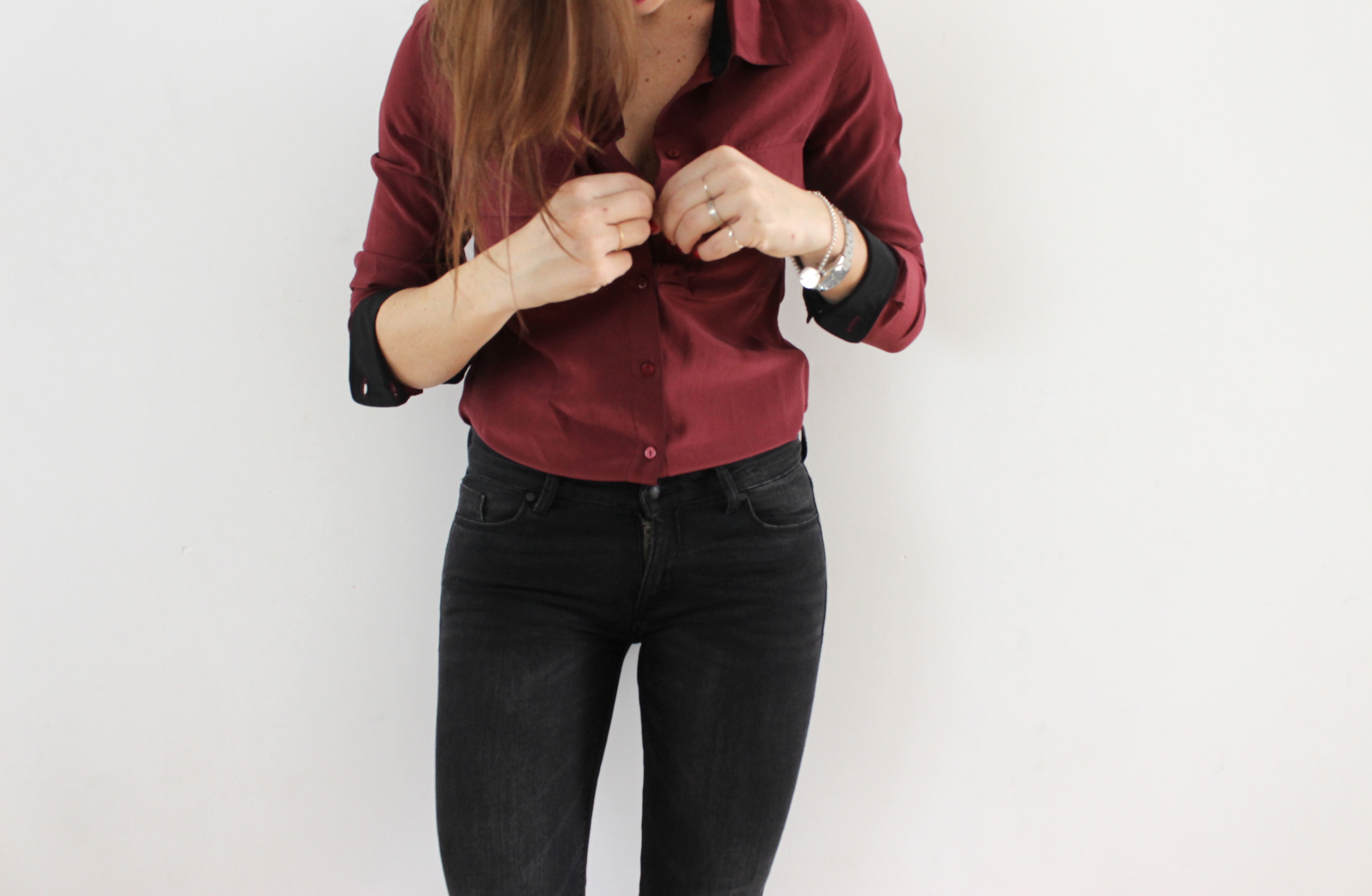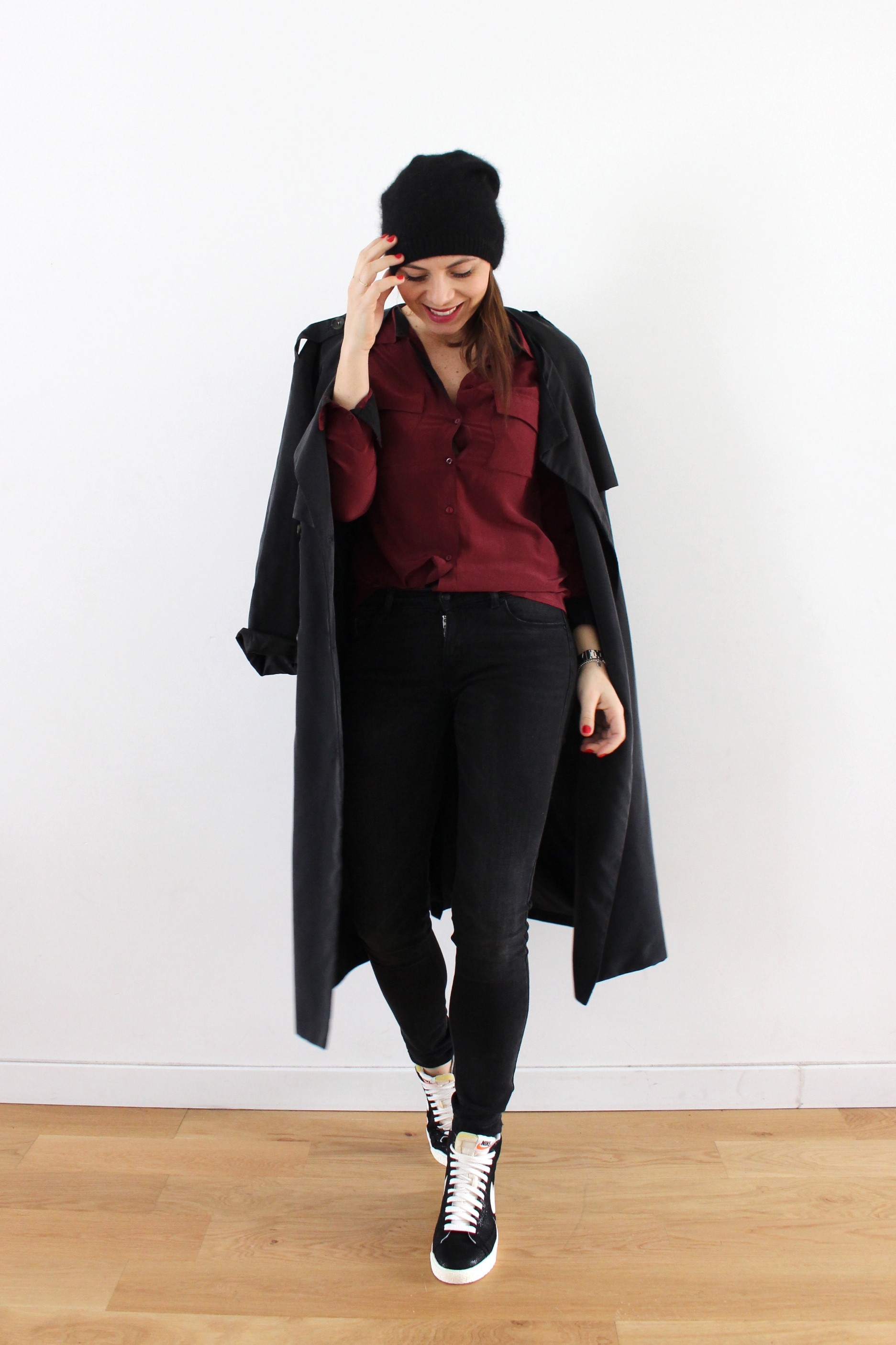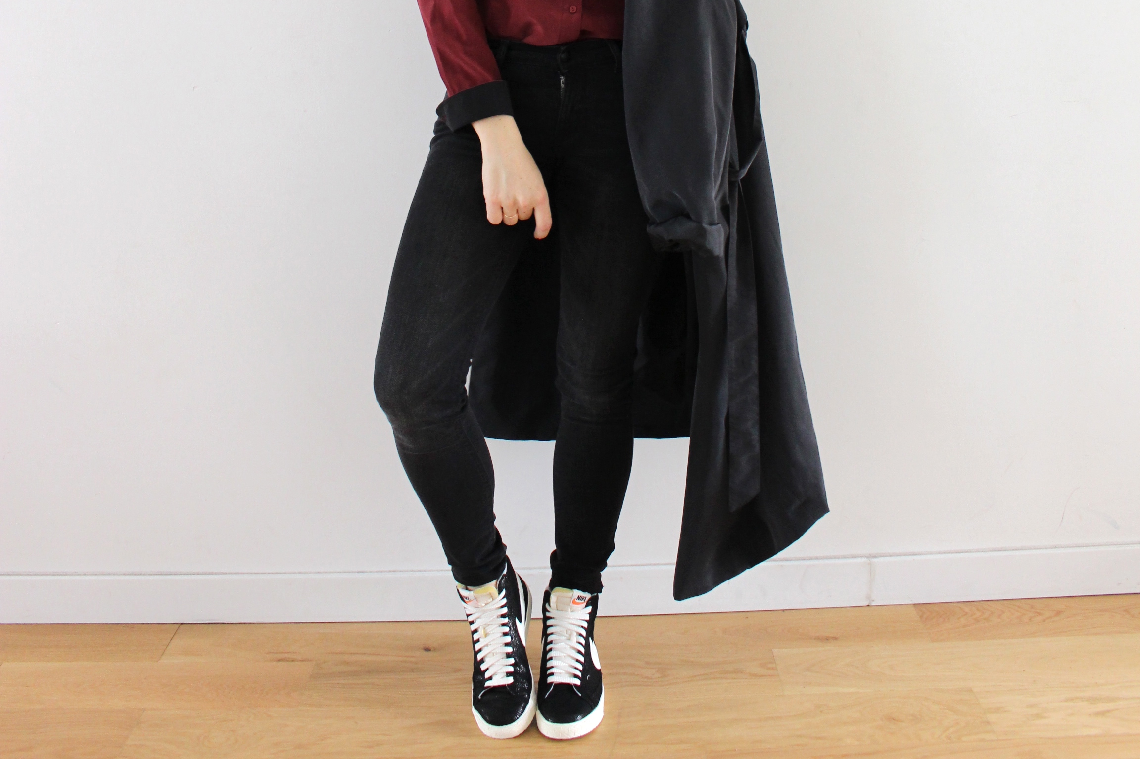 Quand on a un métier qui nous permet de porter absolument ce que l’on veut « vestimentairement » parlant, on peut clairement se faire plaisir en portant des associations plus cool (voir complètement improbables, oui ça m’est déjà arrivé!). Une chemise à l’aspect plutôt classique et une paire de snakers montantes de la nouvelle collection, (elles brillent vous avez vu on pourrait presque croire que c’est du cuir!) Il est rare que je porte du bordeaux, en même temps ce n’est pas une couleur très présente dans mon dressing et pourtant j’aime beaucoup cette couleur hiver comme été. Le temps étant plus clément ces dernier jours, j’en profite pour ressortir un trench noir HetM et me perdre dedans! Bises!