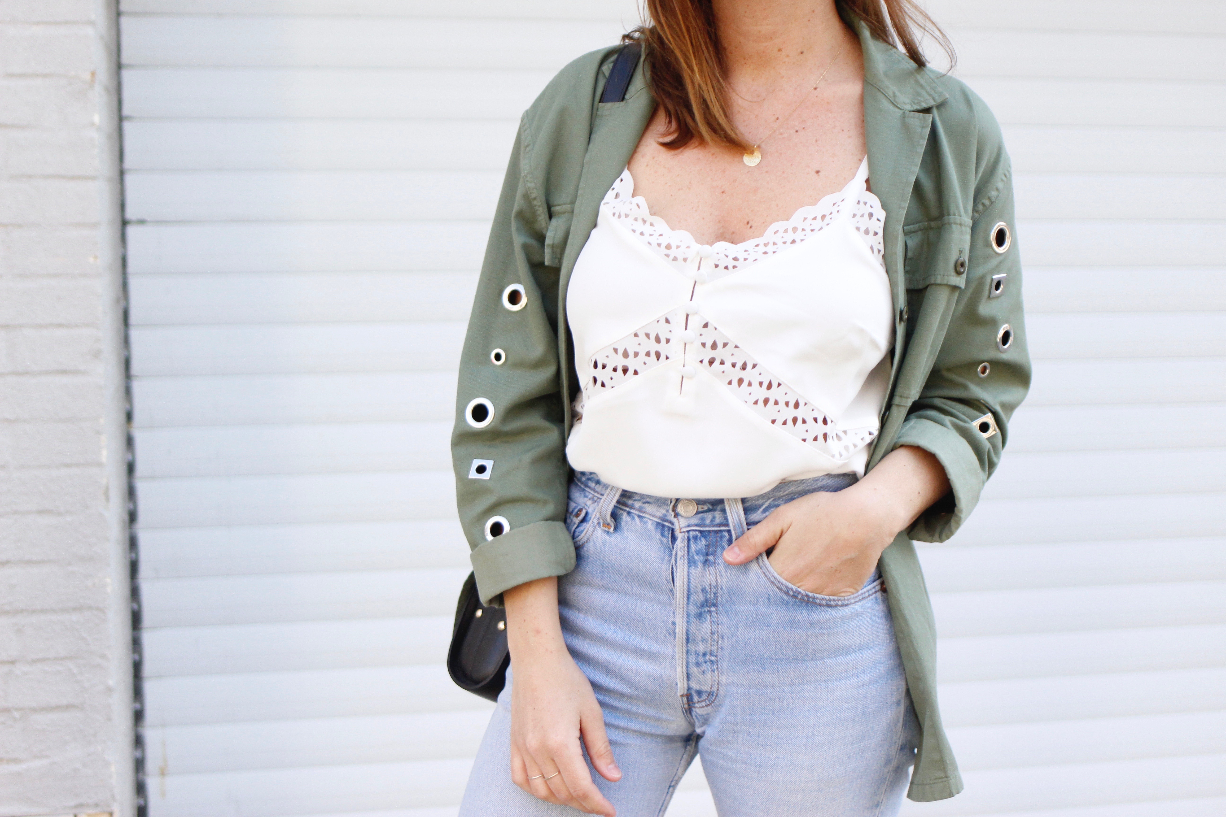 J’aime ce look : le combo du jeans levis brut et de la dentelle ? le raccord top blanc + Birk blanches ? la veste qui termine le look ? L’ensemble certainement ! Subtile mélange qui a du caractère et qui met en valeurs vos formes canon ! :)