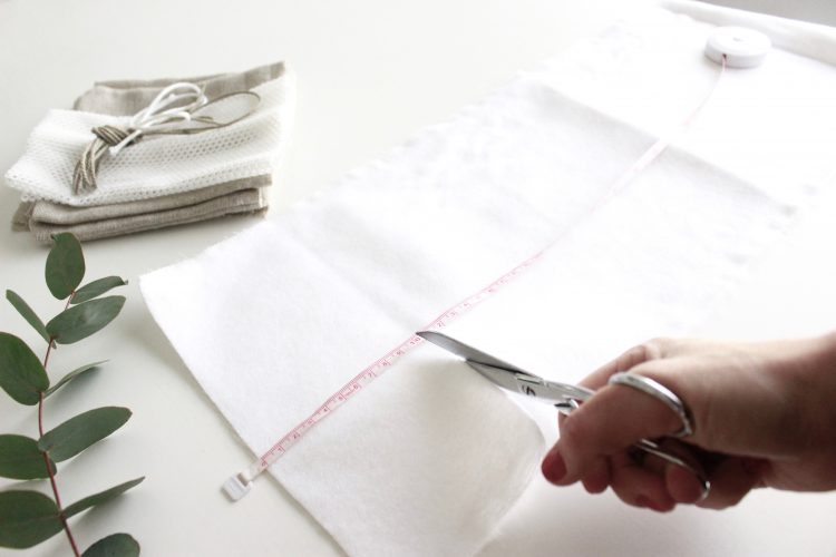 1) Placer votre bande de coton sur une table bien à plat. Divisez votre bande de coton (d’une largeur de 20 cm) en bouts de tissus d’une longueur 10 cm.