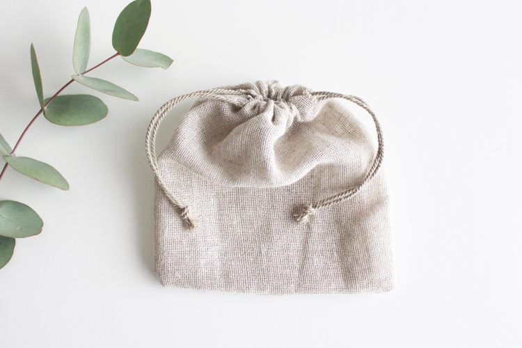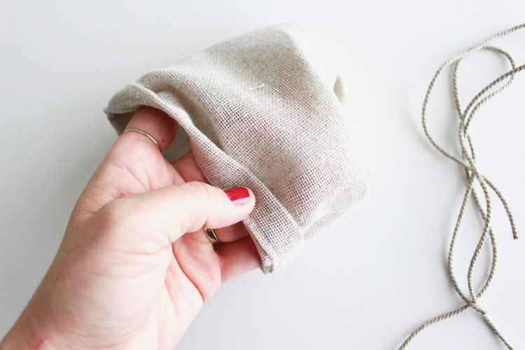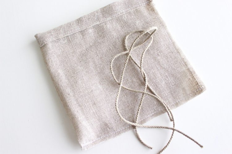 1) Découpez un bout de tissus de lin ≅ 35 cm x 28cm ainsi qu’ un bout de tissus filet ≅ 38cm x 40cm. Vous aurez également besoin de cordelette : environ 4 x 45 cm pour les deux pochettes.