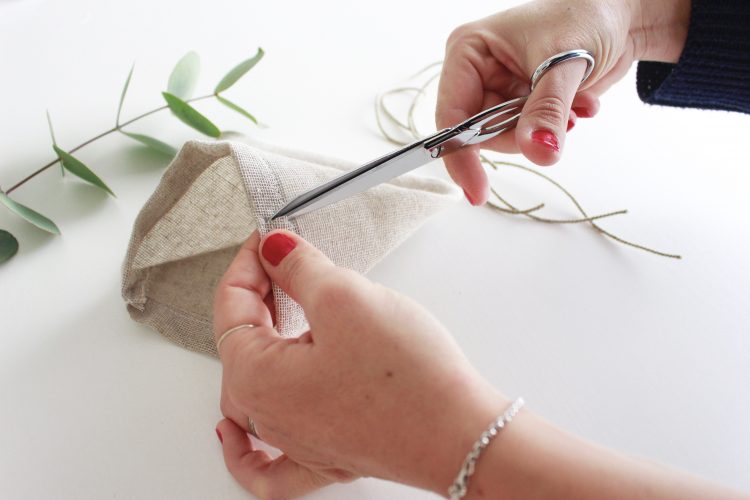 5) Retournez votre pochette afin qu’elle soit à l’endroit. À l’aide de la pointe de votre ciseau faites une petites encoche à chaque extrémité afin de pouvoir y passer la cordelette.