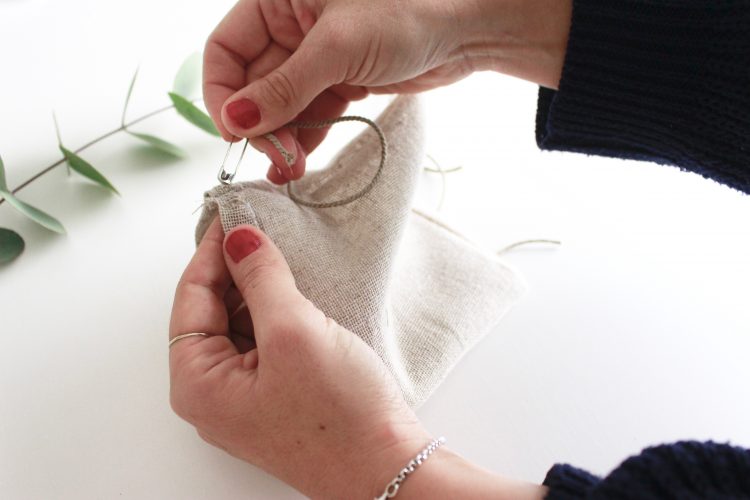 6) Passez le cordon dans un des trou et le faire filer tout au tour de la pochette à l’aide d’une épingle à nourrice. Faites-le ressortir par le même trou. Faire un petit noeud en joignant les deux bout du cordon. Faites la même opération de l’autre coté