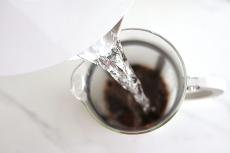 Une fois votre dose de café au fond de la machine, il faut le recouvrir avec de l’eau bouillante, jusqu’à la bague en métal de la cafetière.