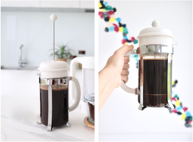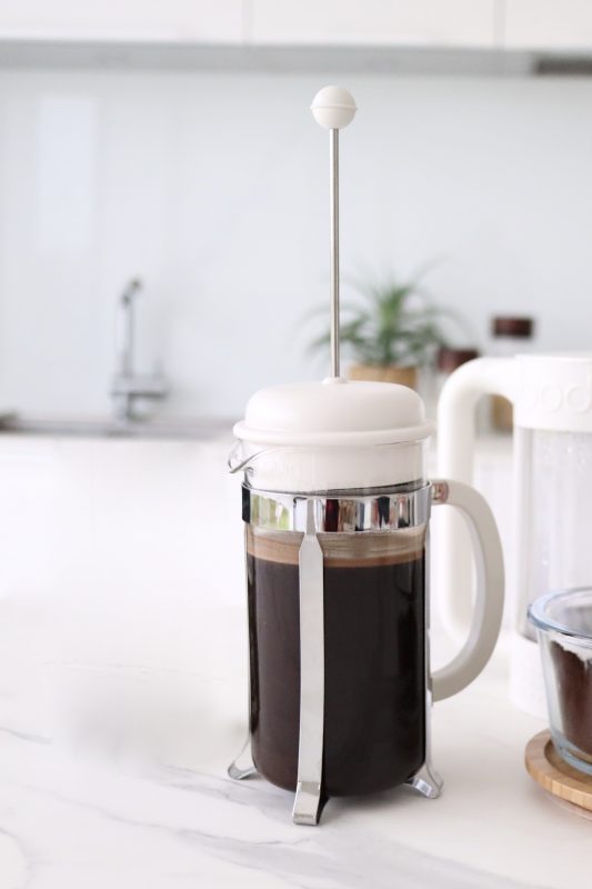 Après avoir attendu 4 minutes d’infusion, il suffira de placer le piston sur le dessus de la cafetière pour commencer à presser le café. Le café doit être pressé en douceur, tout doucement afin que l’eau ne remonte pas. Il faudra presser le café en veillant à bien aller jusqu’au bout de la cafetière.