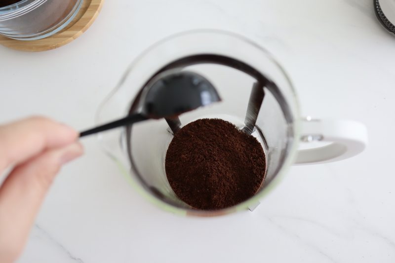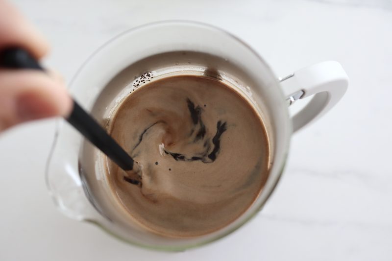 Ensuite, je vous conseillerais de le mélanger avec un petit outils en bois, type baguette chinoise ou cuillère en bois. Le fait de le remuer quelques secondes permet de mieux diluer le café. Il faudra ensuite le laisser infuser 4 minutes.