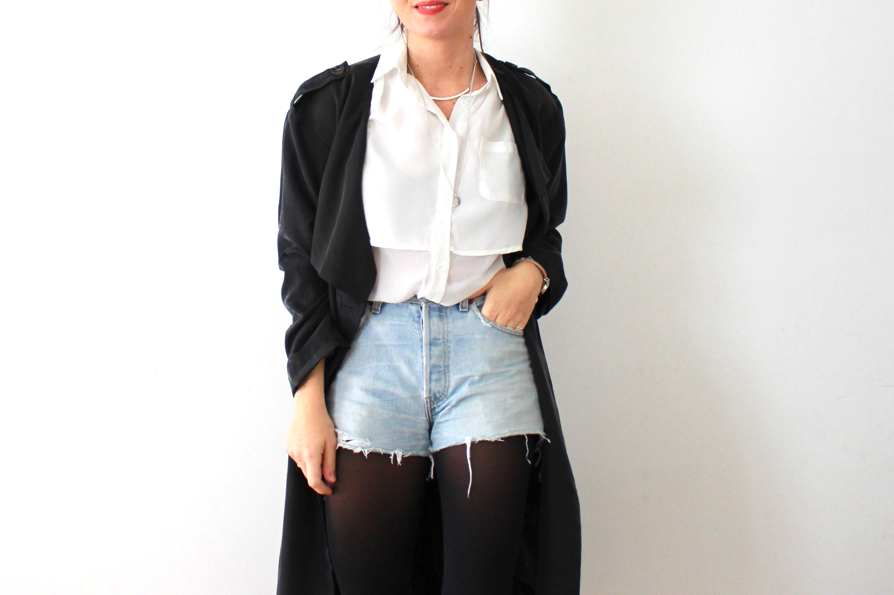 Chemise Lavish Alice Chez Sojeans* // Short Levi’s* // Collant Uniqlo* // Trench et ras de cou HetM // Sautoir Pearlfection* // Bottine NewLook*