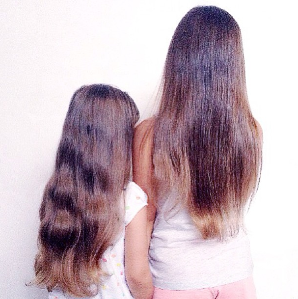 Vous savez quoi? les cheveux longs chez nous c’est histoire de famille… ou presque! J’ai moi même toujours eu les cheveux longs jusqu’à l’année dernière ( >> comme ici << ), approchant des 30 ans je me suis dit qu’il fallait « enfin » que je change de tête, mes filles ont toutes les 2 les cheveux long et ma petite soeur Chloé (photo 4) aussi. Alors dés qu’il s’agit de ciseaux, ici on s’affole! Enfin non, moi, plus, depuis  quelques temps. Mon petit mari chéri ayant (pas) très peu de cheveux, (non je ne suis pas marié à un vieux  rassurez vous! bien qu’il soit quand même vachement plus vieux que moi ;) ) les cheveux des ses filles sont devenus sa bataille ;) Il est interdit pour qui que ce soit de les couper, de s’en approcher même! Je suis la seule qui est le droit de les couper avec des ciseaux de cuisine, oui car les ciseaux de cuisine coupent beaucoup moins bien que des vrais ciseaux de coiffeuse, mais pas plus de 2 cm par mois, s’il vous plait, au risque qu’il me fasse une crise de nerfs, ou pire encore : une syncope! Avec la longueur que mes filles se trainent on me demande souvent, comment je fais pour les entretenir, mais surtout pour les coiffer le matin avant l’école. Maelle et Laura ne sont pas sensible des cheveux ou presque pas, il est très rare qu’elles se mettent à crier lorsque je les coiffe, (et pourtant je ne suis pas des plus douce), ou alors si, ça arrive quand je perd patience, ou quand Maelle se colle du chewgum dedans et croyez moi ça, ça arrive régulièrement. Ensuite, maintenant que Laura est grande, je lui demande de se passer un premier coup de brosse tous les matins et tous les soirs avant que je passe à la phase terminal : le démêlage intensif et la coiffure. J’ai demandé à Maelle il ni a pas longtemps de faire la même chose, de commencer à se démêler les cheveux toute seule, et à plusieurs reprise la brosse c’est trouvé emmêlé dans sa tignasse  au centre de sa tête! Un vrai calvaire! A noté : attendre 2-3 ans pour réitérer l’expérience. La petite dort souvent avec des tresses afin de faciliter le démêlage du matin mais aussi pour gagner un maximum de temps, car le matin, 1 minute c’est 1 minute! Et voilà, on vise pour 2016 la longueur de Raiponce! Souhaitez moi bon courage! Bises