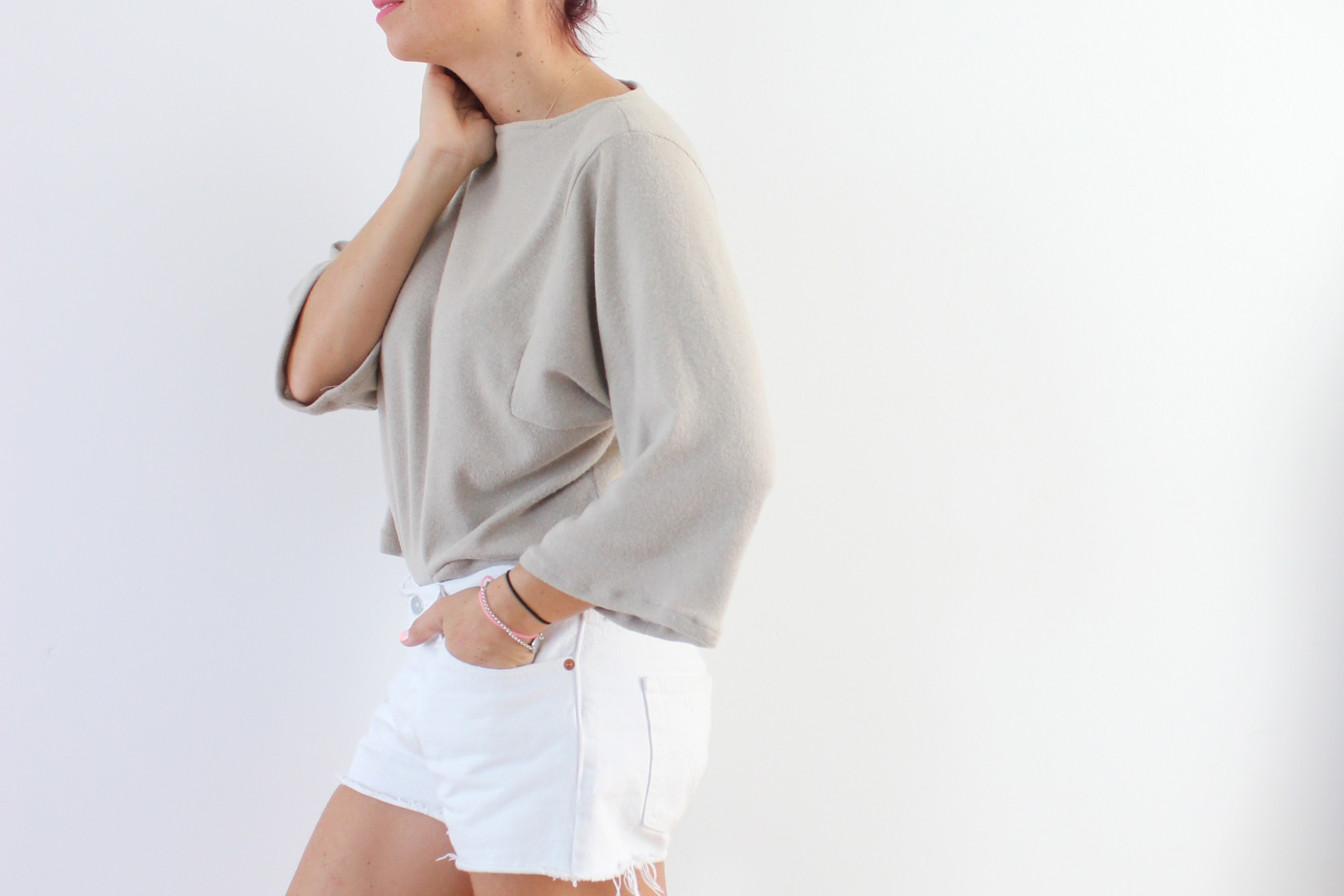 Comme il fait encore beaux, mais qu’il me tardait de vous le présenter, j’ai choisi de le porter avec un short blanc et une paire de sandales cloutées, mais je crois que c’est le genre de top que l’on peut assortir avec tout, c’est d’ailleurs un peu le but de nos modèles vous le savez bien, des couleurs et coupes basiques et intemporels. (je me répète hein?) Je l’ai d’ailleurs porté un soir avec jean et une paire de baskets, c’était aussi très bien.