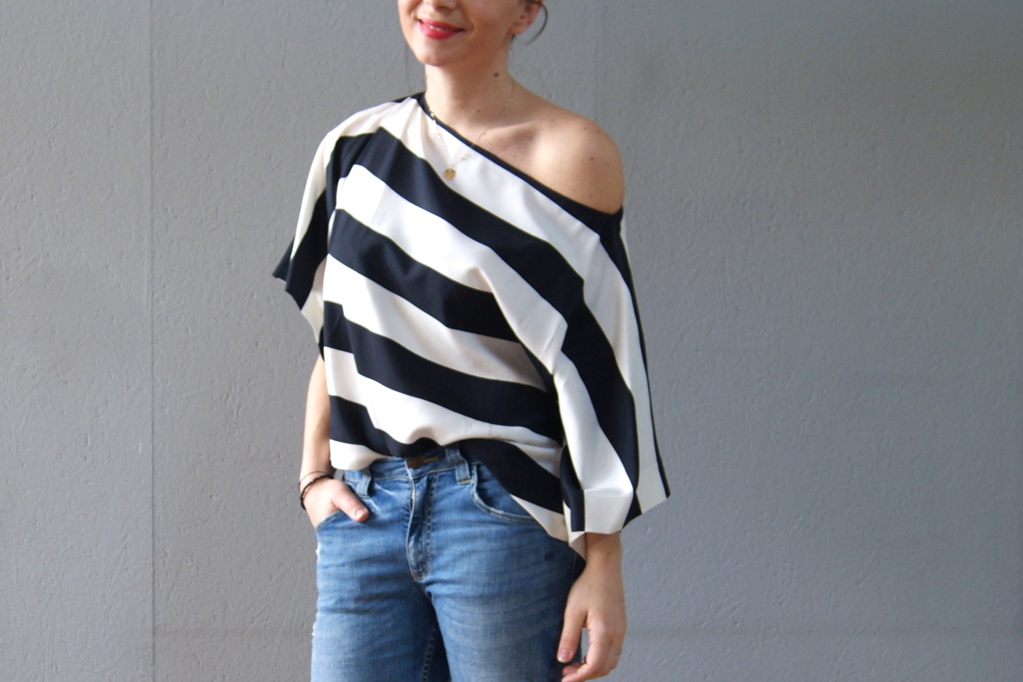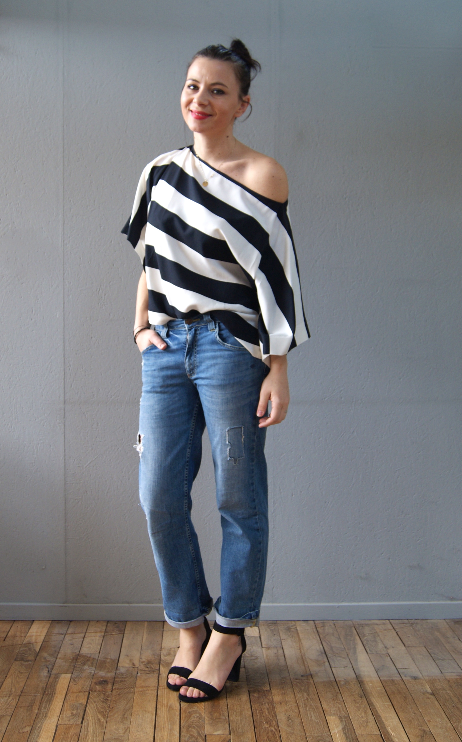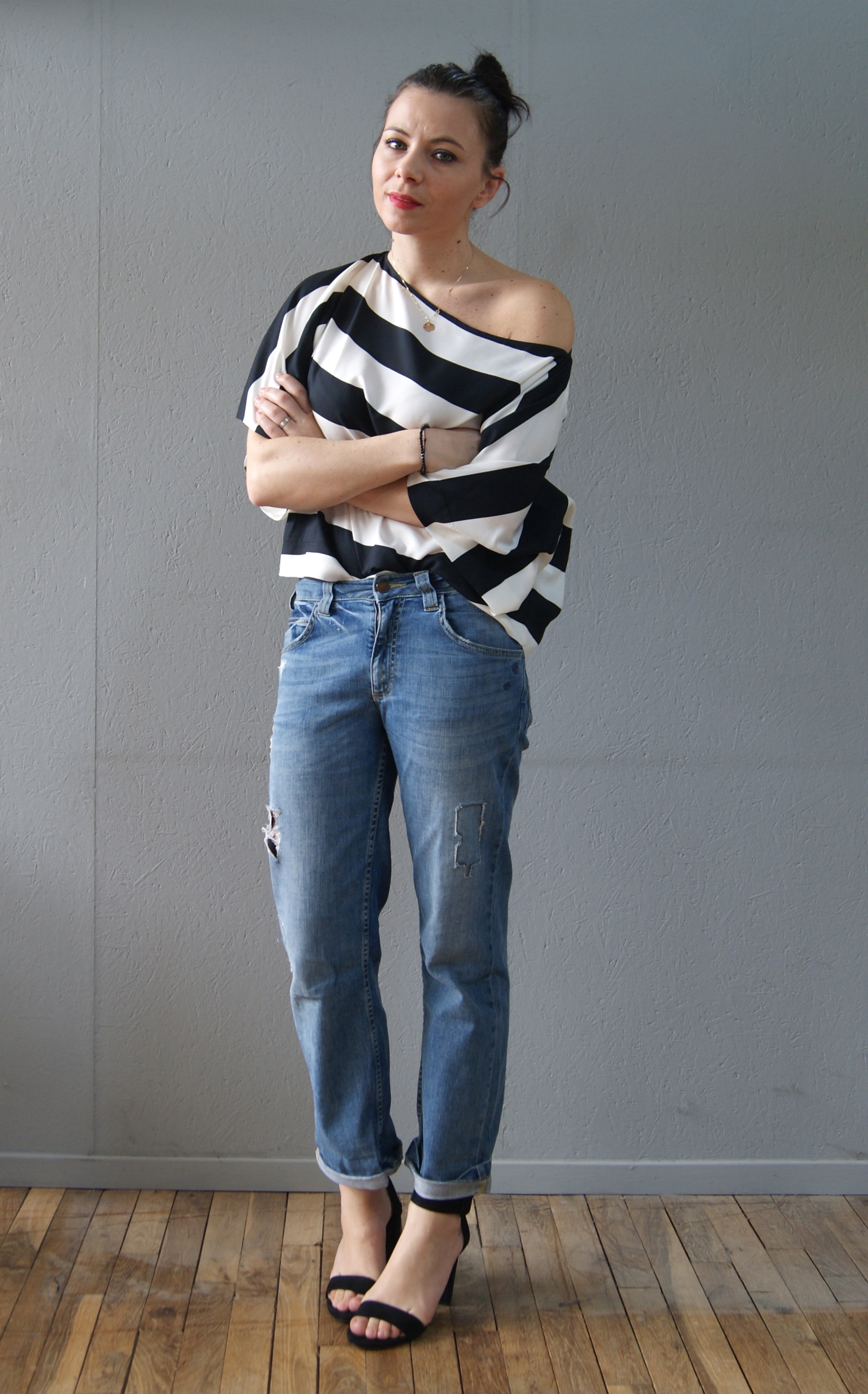 Boyfriend en bas mais tout de meme féminine en haut avec cette epaule joliment devoilée