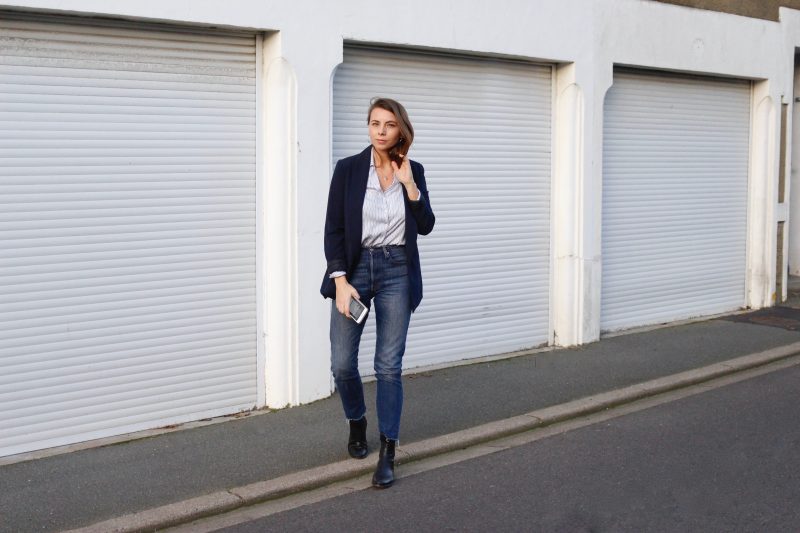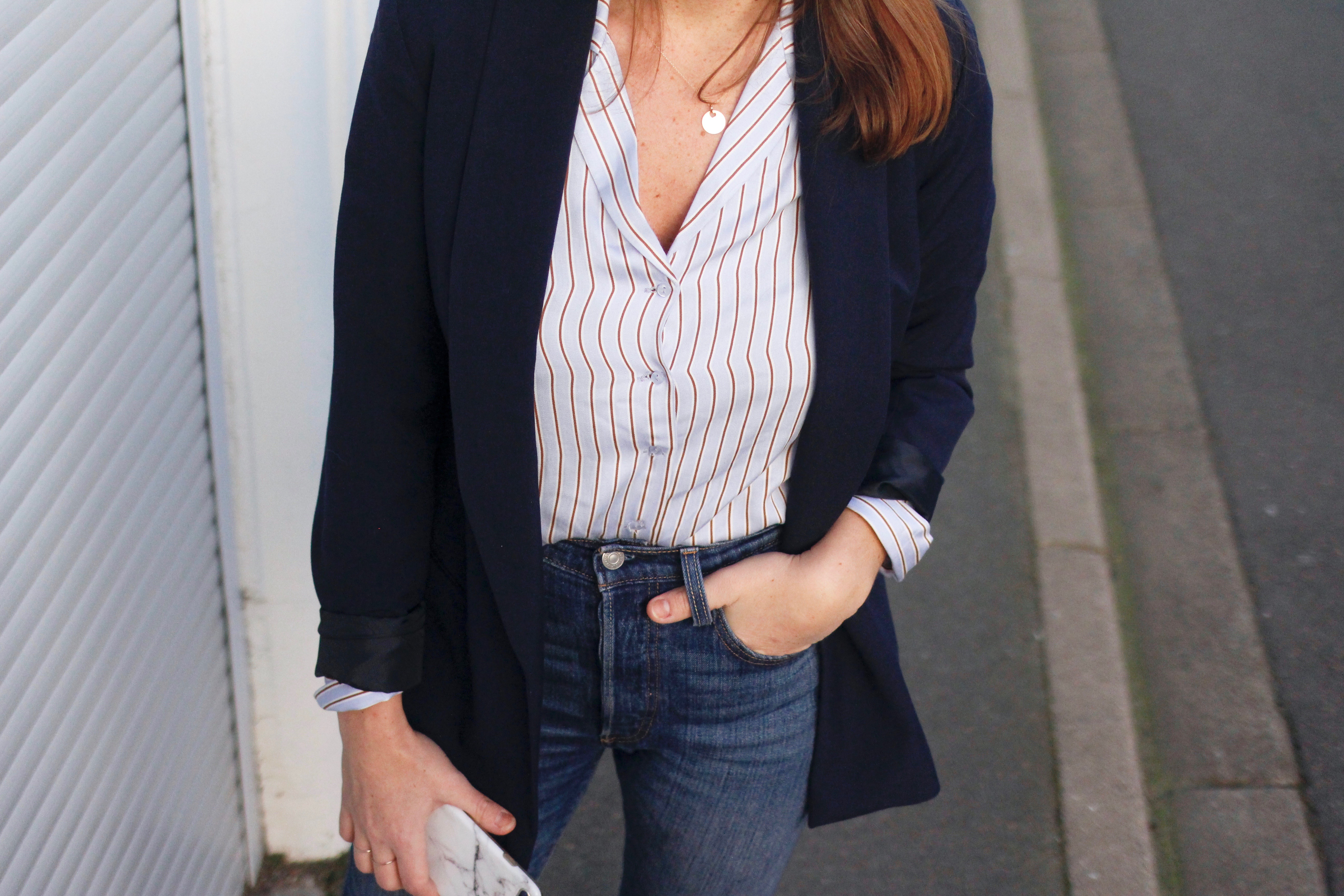 Du bleu, encore du bleu, toujours du bleu… J’ai profité des quelques beaux jours de la semaine dernière pas loins de 18 degrés par ici, pour ressortir mon blazer bleu marine et l’assortir à cette chemise pyjama soldée sur laquelle j’ai eu un petit coup de coeur. Je ne sais pas si vous aviez lu mon article sur les basiques, mais clairement j’aurai pu y rajouter un blazer bleu marine qui d’après-moi reste facile à porter. Bien que je ne le porte souvent, c’est une pièce que j’ai dans mon dressing depuis bien des années et que je prends toujours plaisir à (re)sortir.