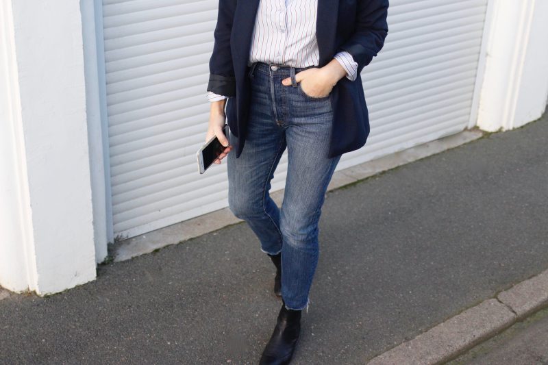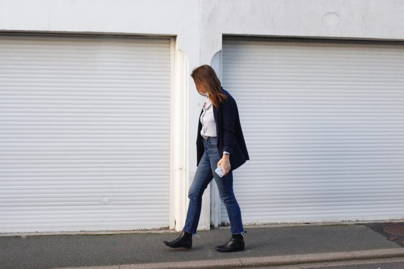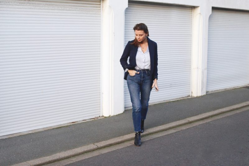 Chemise Mango / Blazer / jean Levi’s / bottines Atelier Voisin