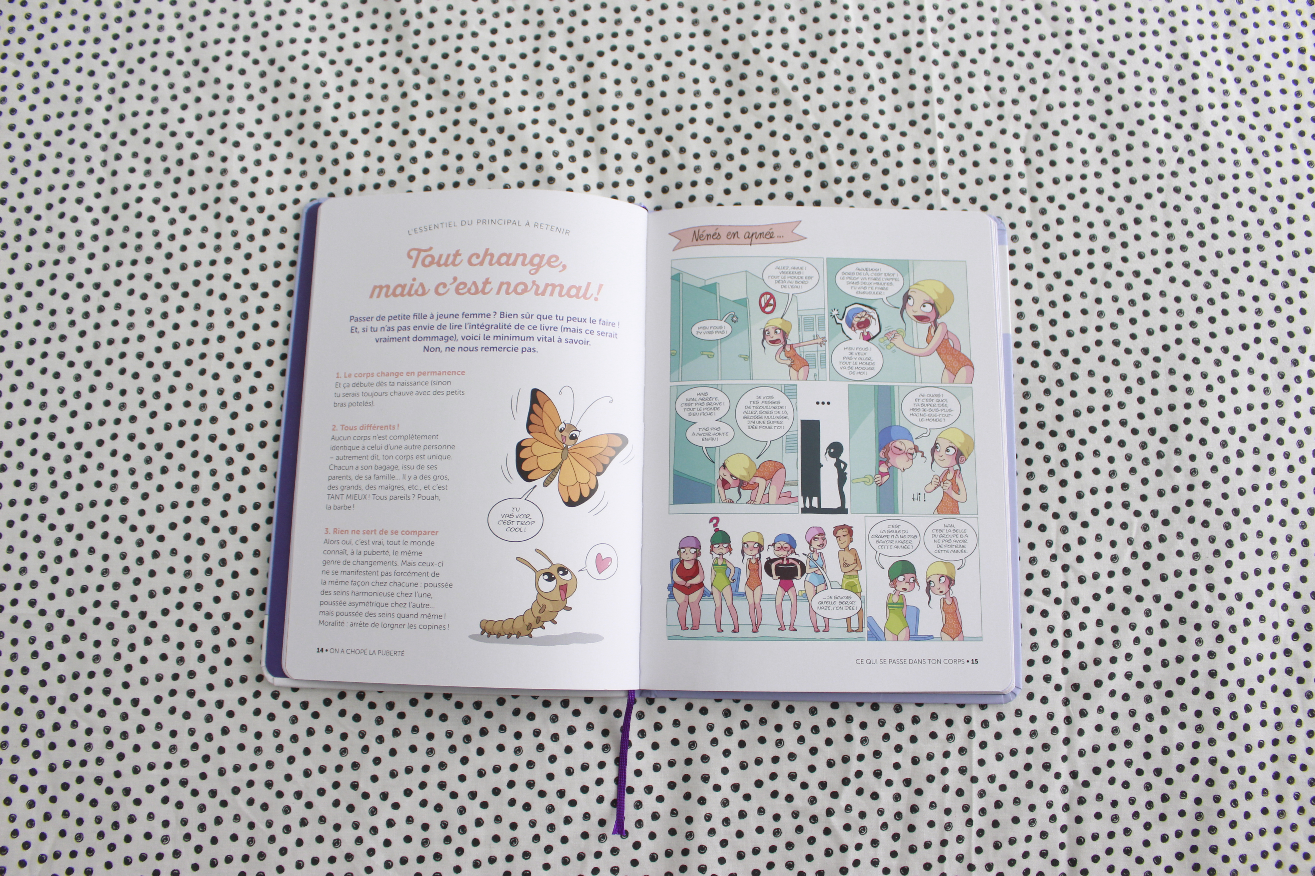 J’ai donc passé deux heures à lire « On a chopé la puberté » dans sa totalité, en cachant chaque page dès que Laura et Maelle s’approchaient de moi (oui vous m’avez drôlement fait flipper) et le premier point qui en ressort est que le livre a pour but de donner confiance en soi et d’accepter son corps tel qu’il est. C’est sincèrement ce que j’ai ressenti même si cela est parfois exprimé maladroitement pour des jeunes lecteurs, je vous l’accorde.