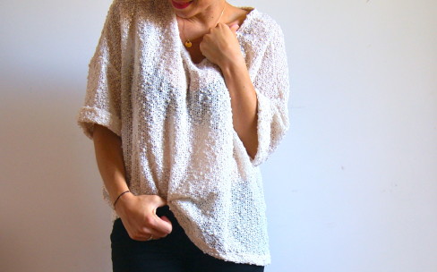 Un pull mega loose qui brille, des petites sandales, et un « super » chignon!
