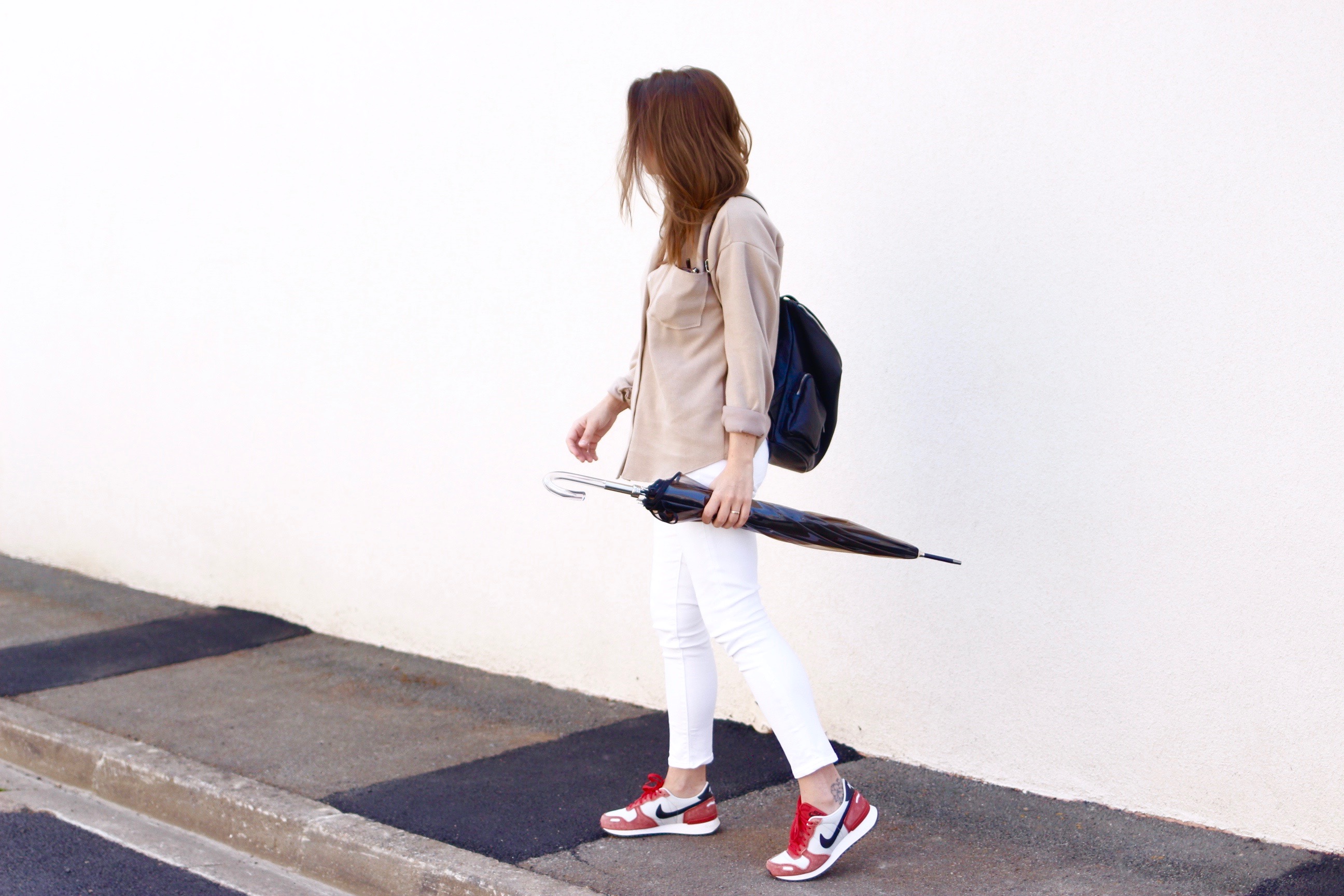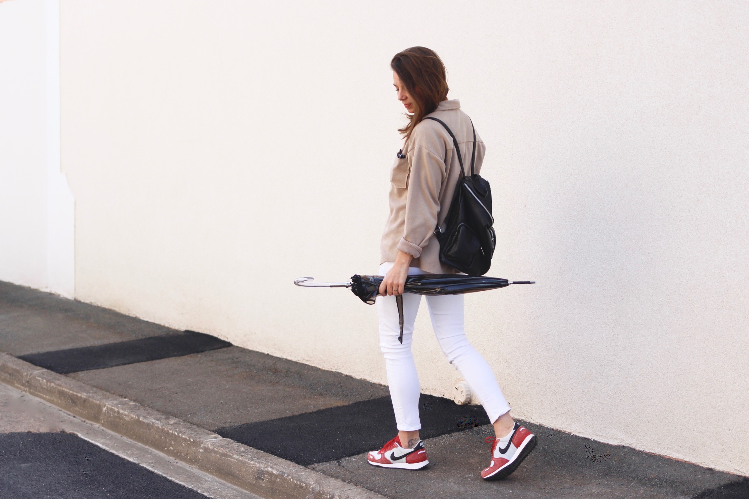 Je porte un parapluie Piganiol / un jean Levi’s coupe 721 / une chemise Zara / des basket Nike / Un sac à dos Giorgo Costa