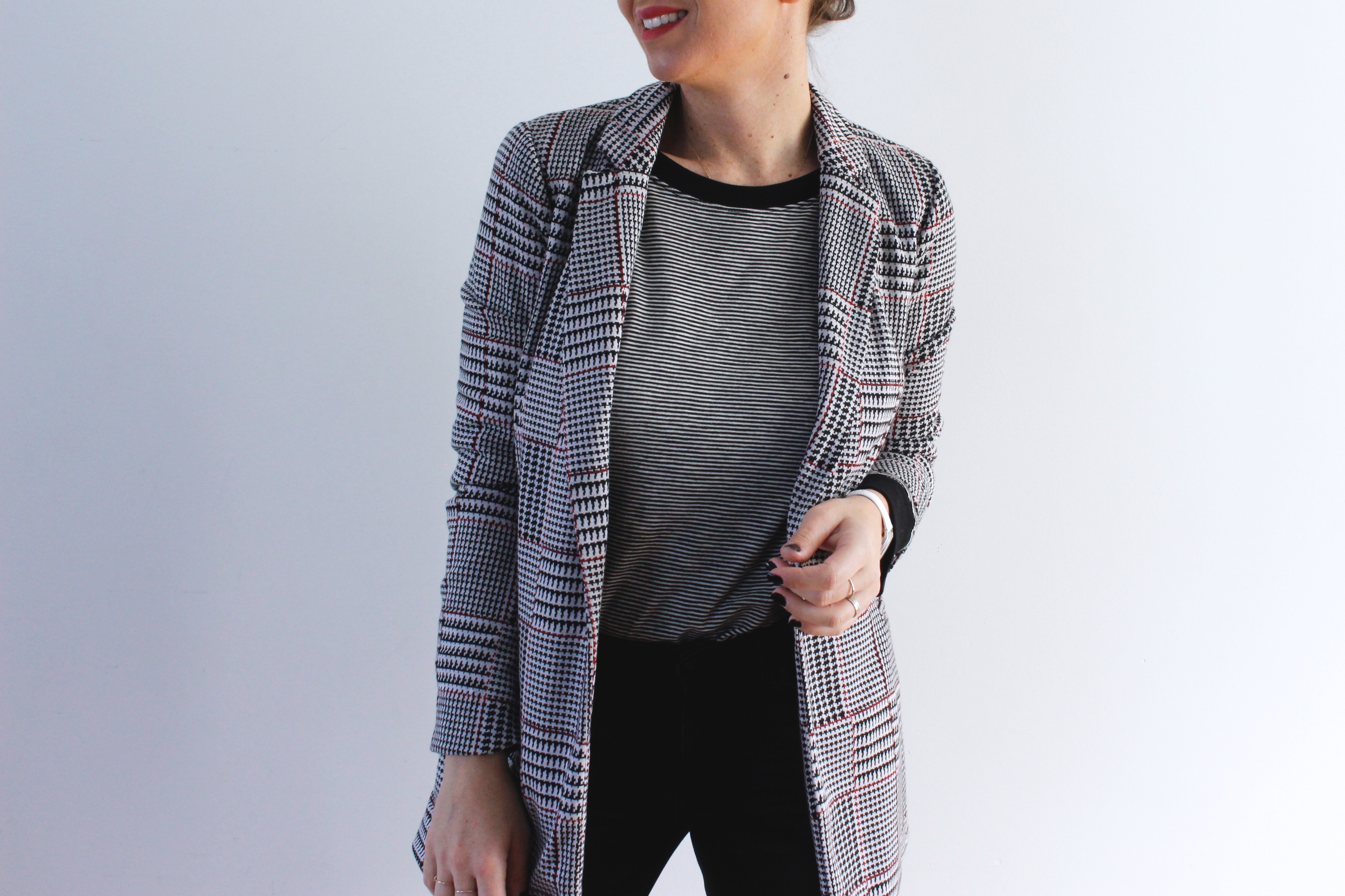 J’associe un sweat à fines rayures et une veste tartan pour mon plus grand plaisir, mais surtout pour porter deux pièces que j’aime beaucoup, je trouve l’association plutôt cool, et puis comme je vous le dis souvent, question mode il n’y a pas tellement de règles, l’essentiel est de se sentir bien dans ses fringues! À ça un jean slim qui vient de chez Mango une paire d’escarpin super confort de chez Zara le tout assortie à une jolie montre Guess blanche. Guess propose des coffrets pour les fête la montre est donc assortie à un bracelet que vous pouvez découvrir par ici, le cadeau deux en un, idéal pour Noël.