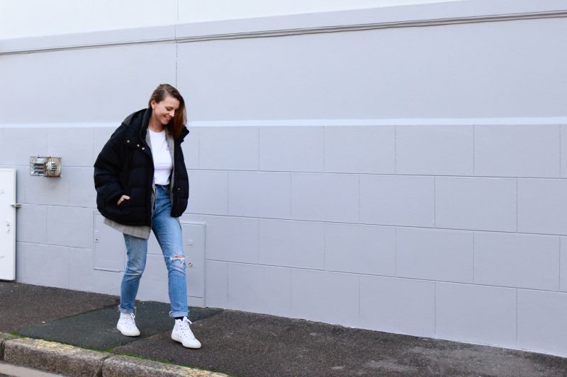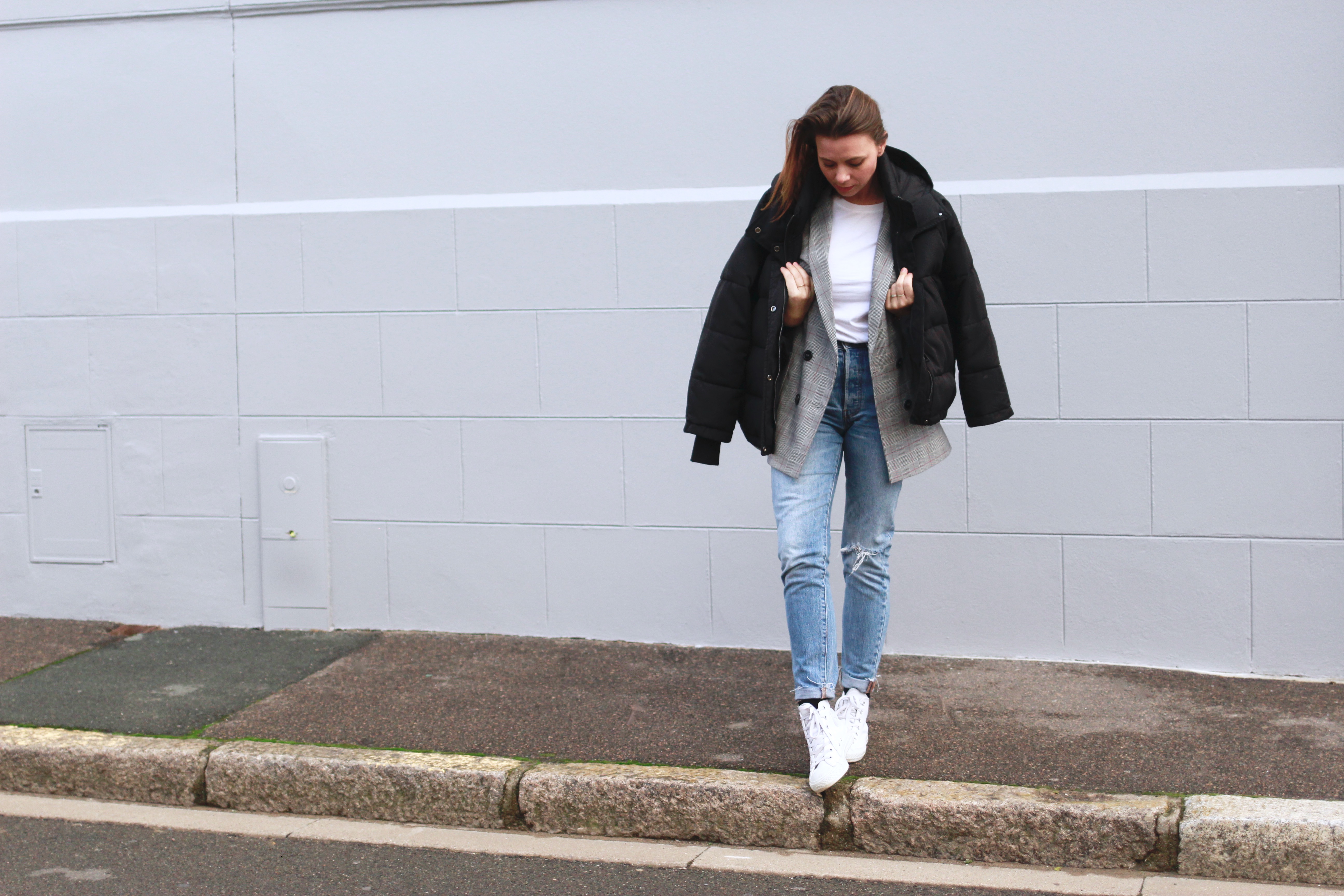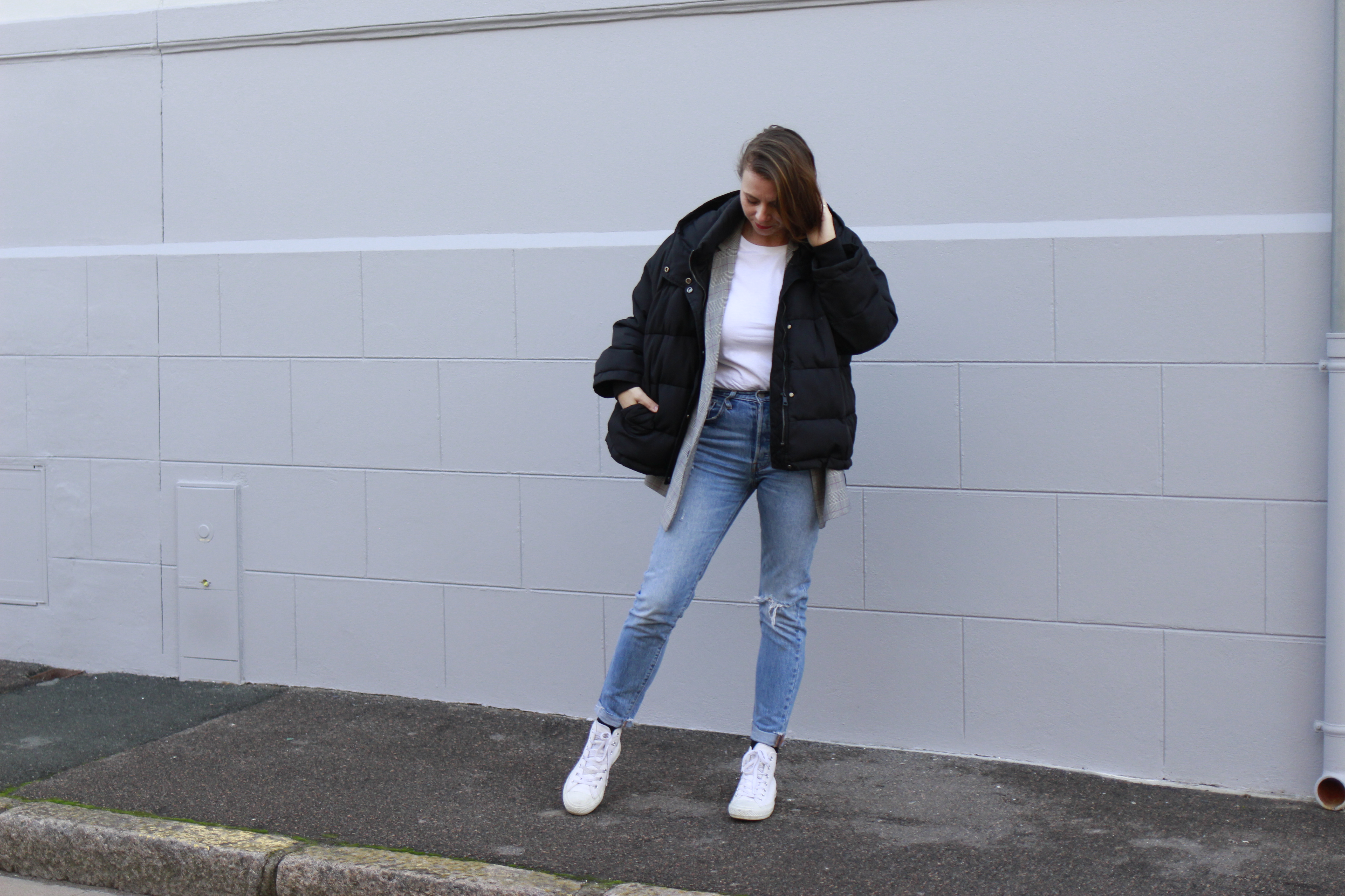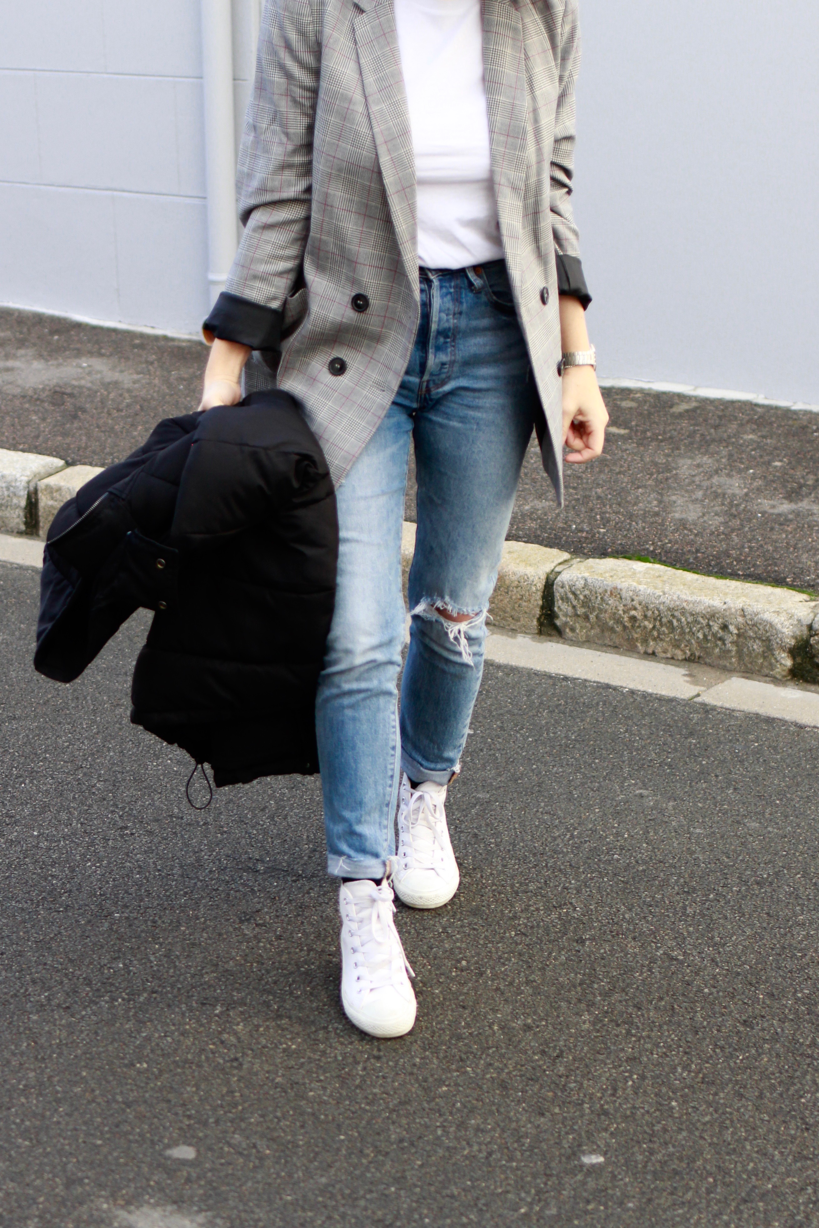 Converse et Jean Levi’s 501 Skinny Chez Spartoo* / Blazer Kiabi / Tee-shirt L’affaire de Refus* / Doudoune HetM