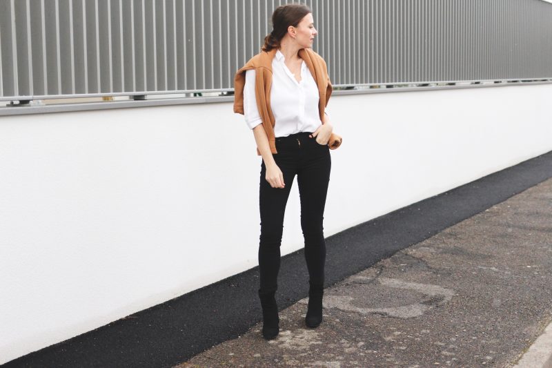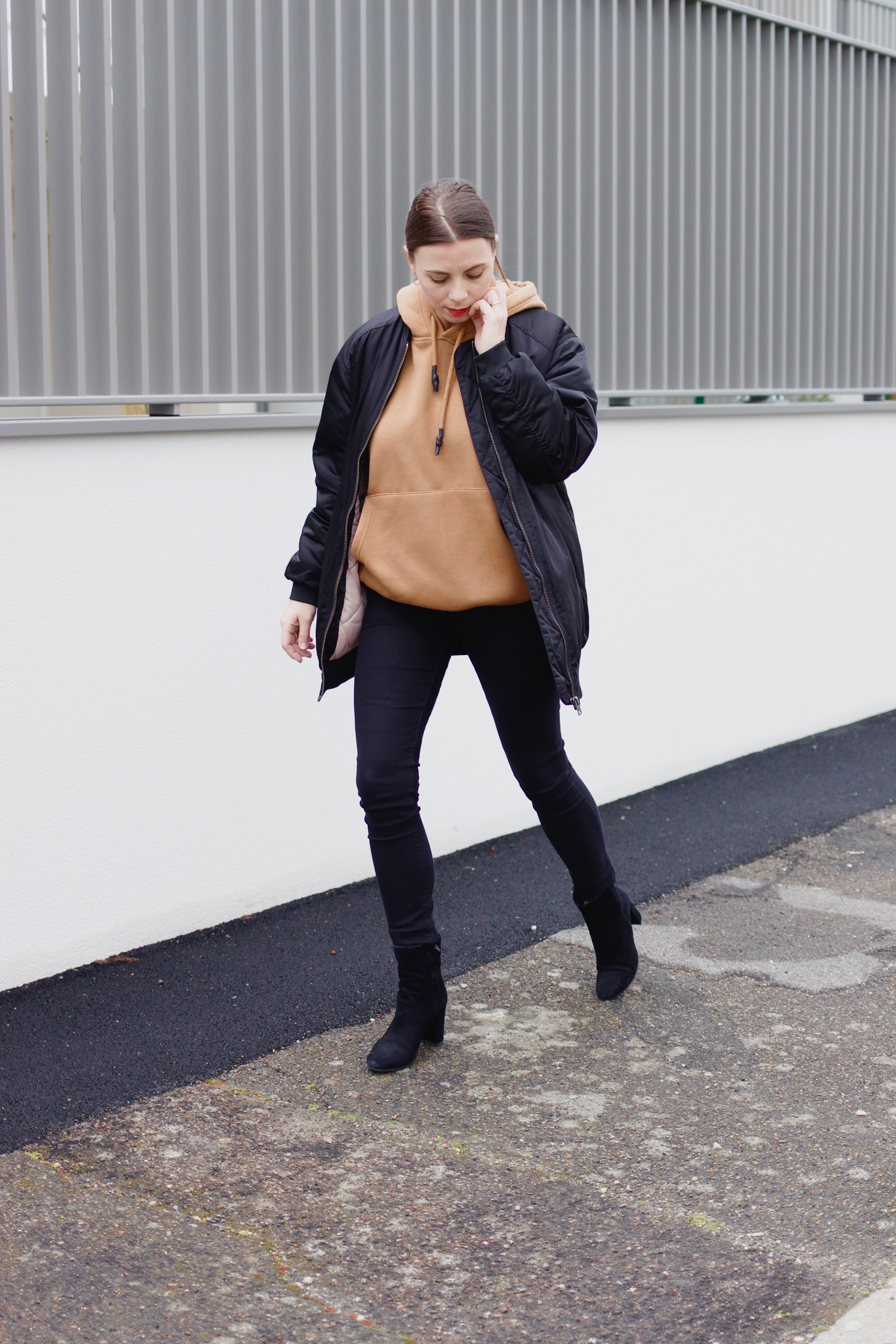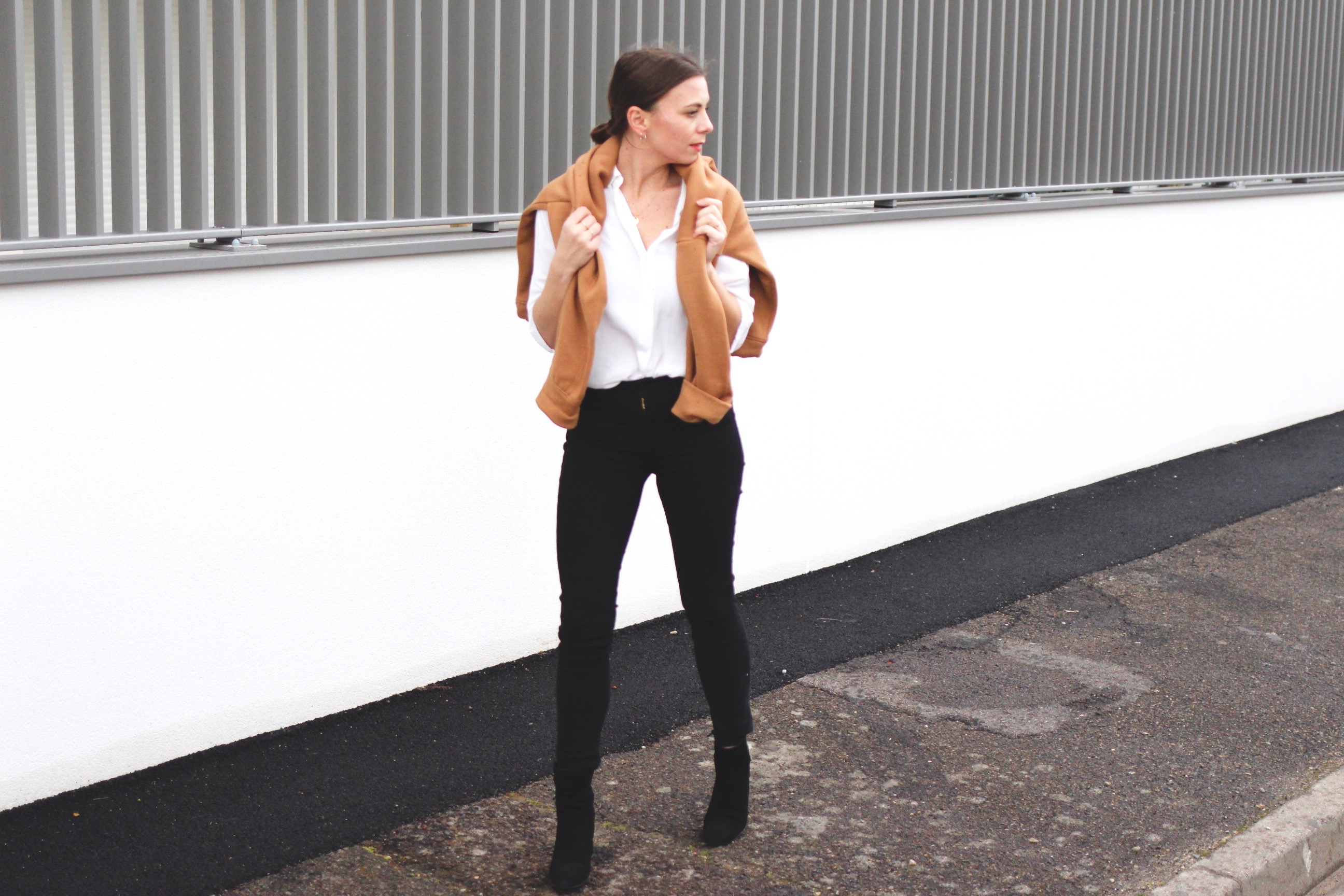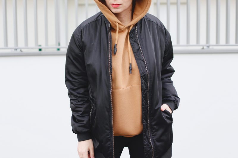 Bref, un petit look de circonstance cette semaine avec un sweat à Capuche loose et sa couleur camel/terracotta qui revient à fond. Un bomber XL un jean skinny, une chemise blanche et une paire de boots à talons hautes mais confortables. L’idée d’associer un grand sweat et une chemise blanche est de donner à cette tenue une face A avec un style décontracté et une face B avec une tenue « habillée » ! L’équation parfaite pour les journée rendez-vous où il faut courir partout !