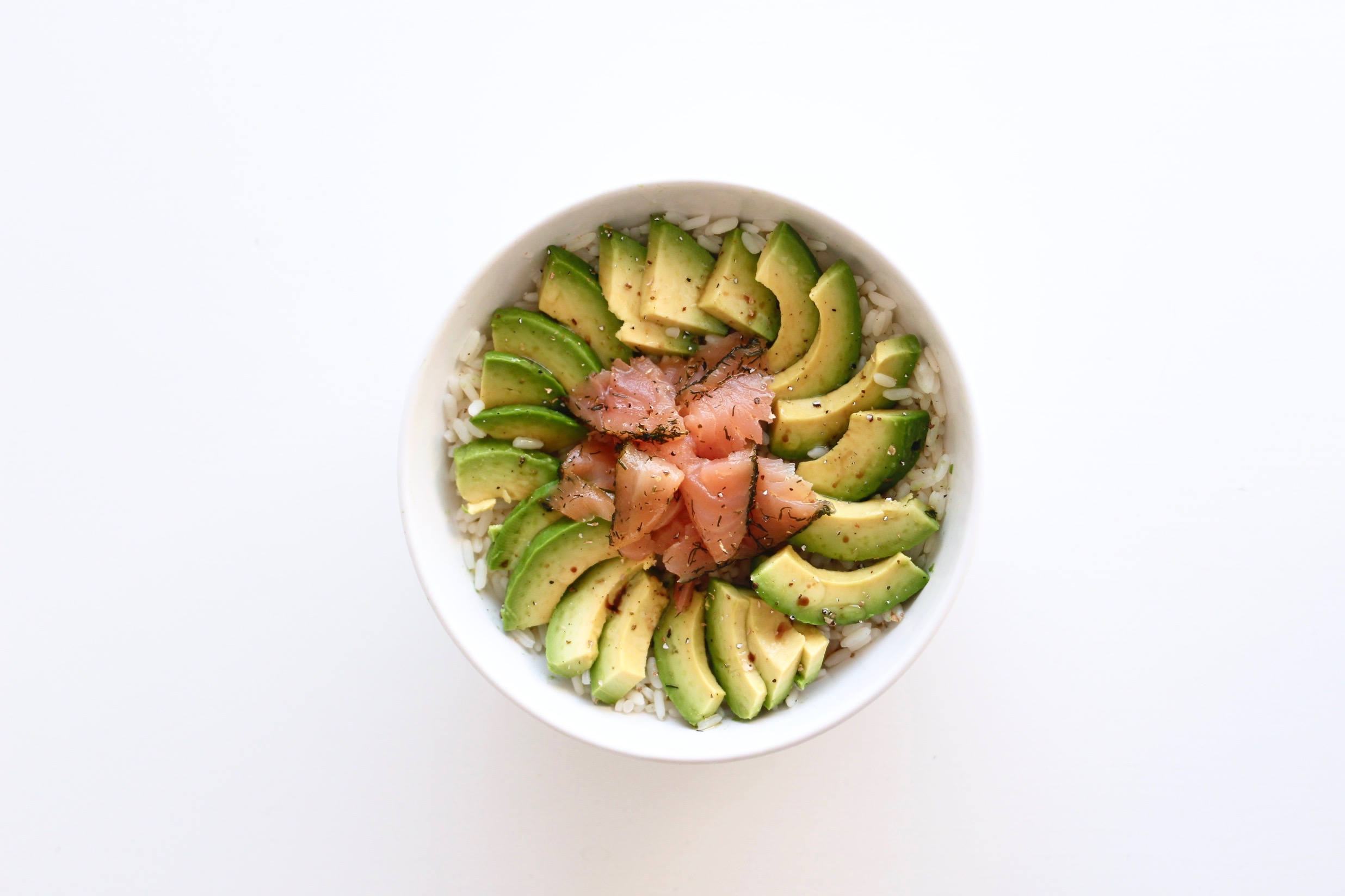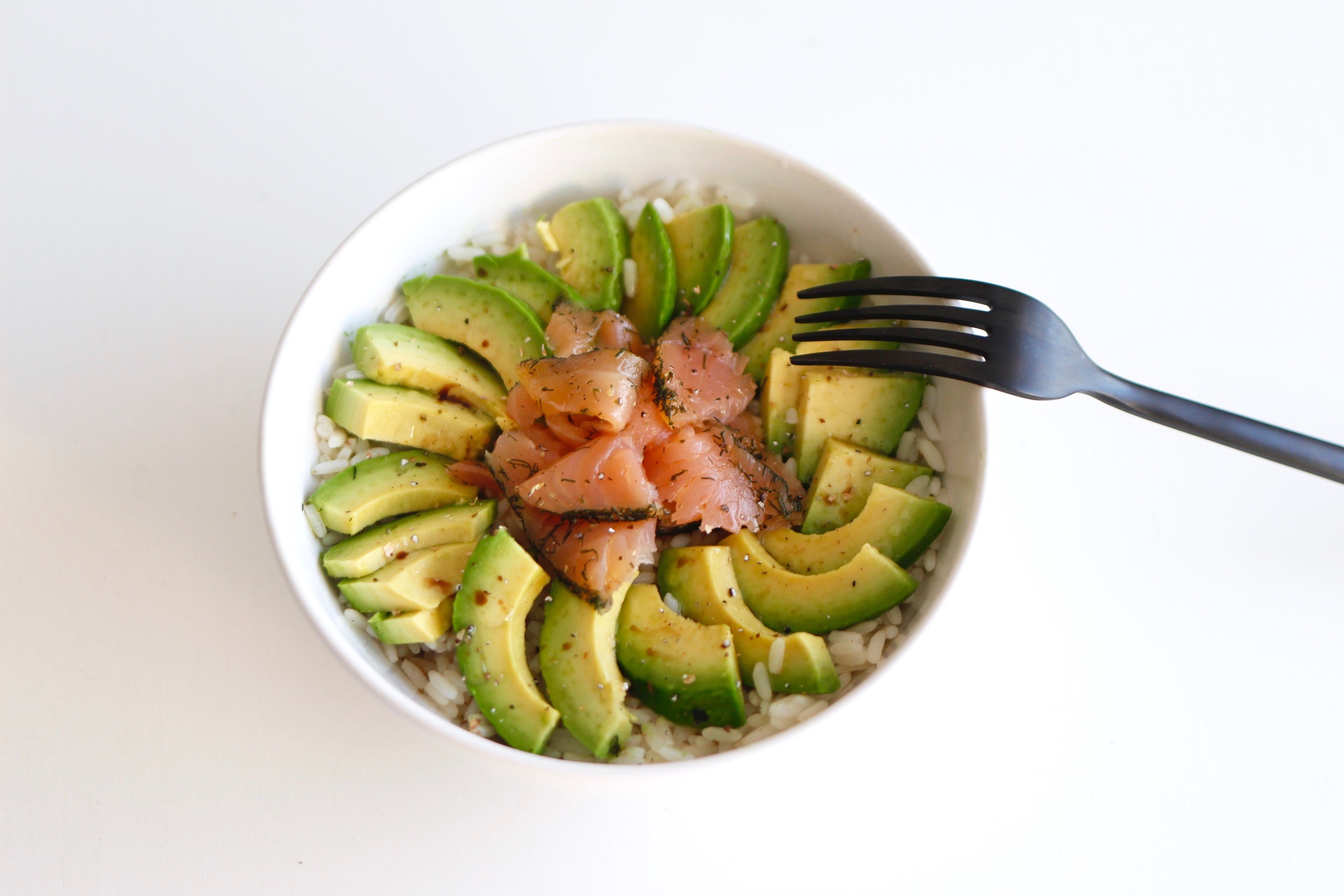 Celle-ci, se compose de trois ingrédients : riz, saumon (mariné, fumé ou cru) et avocat (1/2 voir un entier par personne selon votre faim) et reste l’une de nos préférées. On peut également y ajouter des pois frais comme des edamames que j’adore également. Restera à faire la vinaigrette de votre choix. C’est ultra simple et délicieux.