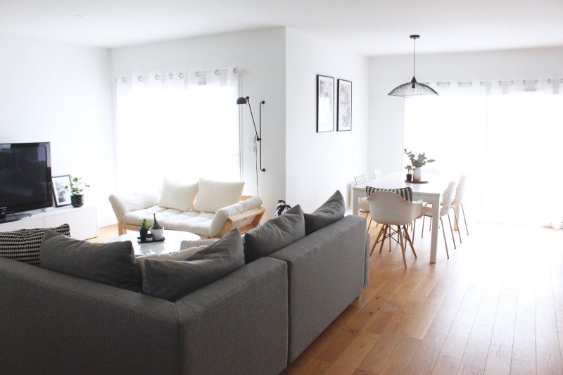 Si je devais faire un bilan déco de ces 6 années passées dans cette maison, je dirais que nous sommes arrivés à une déco plutôt « abouti » au moment où nous allons partir. Bien que je souhaite encore changer mes chaises de salle à manger, ma suspension, mon buffet Ikea que je dois avoir depuis plus de 10 ans (et qui devient tout moche) et la bibliothèque… je dois dire que nous nous y sentons bien. Effectivement la décoration et l’ameublement c’est un budget et ce n’est pas toujours évident d’aménager son intérieur comme on le souhaiterait, (encore plus si vous êtes comme moi, que vous vous lassez vite et que vous avez envie de tout !) Nous avons durant ces 6 années, changé les uns derrière les autres les meubles, puis ajouté des plantes, de la déco selon les rentrées d’argent que nous avions. J’avoue que j’ai souvent été très impatiente de changer certains meubles, mais il m’a fallu attendre régulièrement quelques mois pour pouvoir nous les offrir. Je n’ai pas de photo de notre intérieur lorsque nous sommes arrivés, et je le regrette, mais c’était loin d’être aussi agréable qu’aujourd’hui. Nous avions un BZ en guise de canapé, une table de salon premier prix (9€ il me semble) de chez Ikea, pas de tapis, et une table ronde récupérée dans le grenier de ma maman pour la salle à manger (sans chaises) et deux tabourets rouges autour de la table de la cuisine.