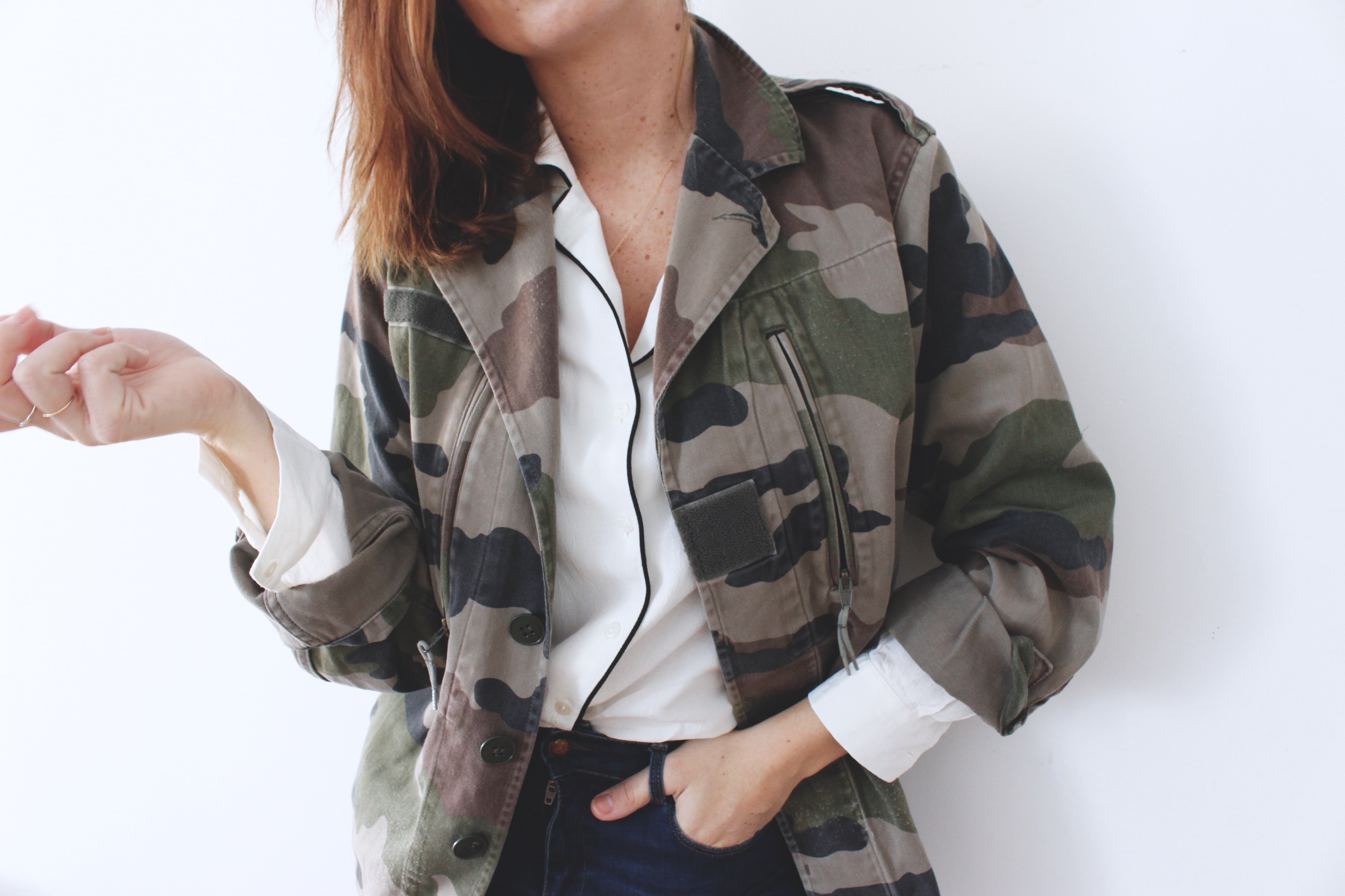 Pour ma part j’ai jeté mon dévolu sur une veste militaire, le mienne vient du  » 1er régiment médical  » j’adore! Je l’ai associé à une chemise blanche, un jean slim et une paire de bottine.