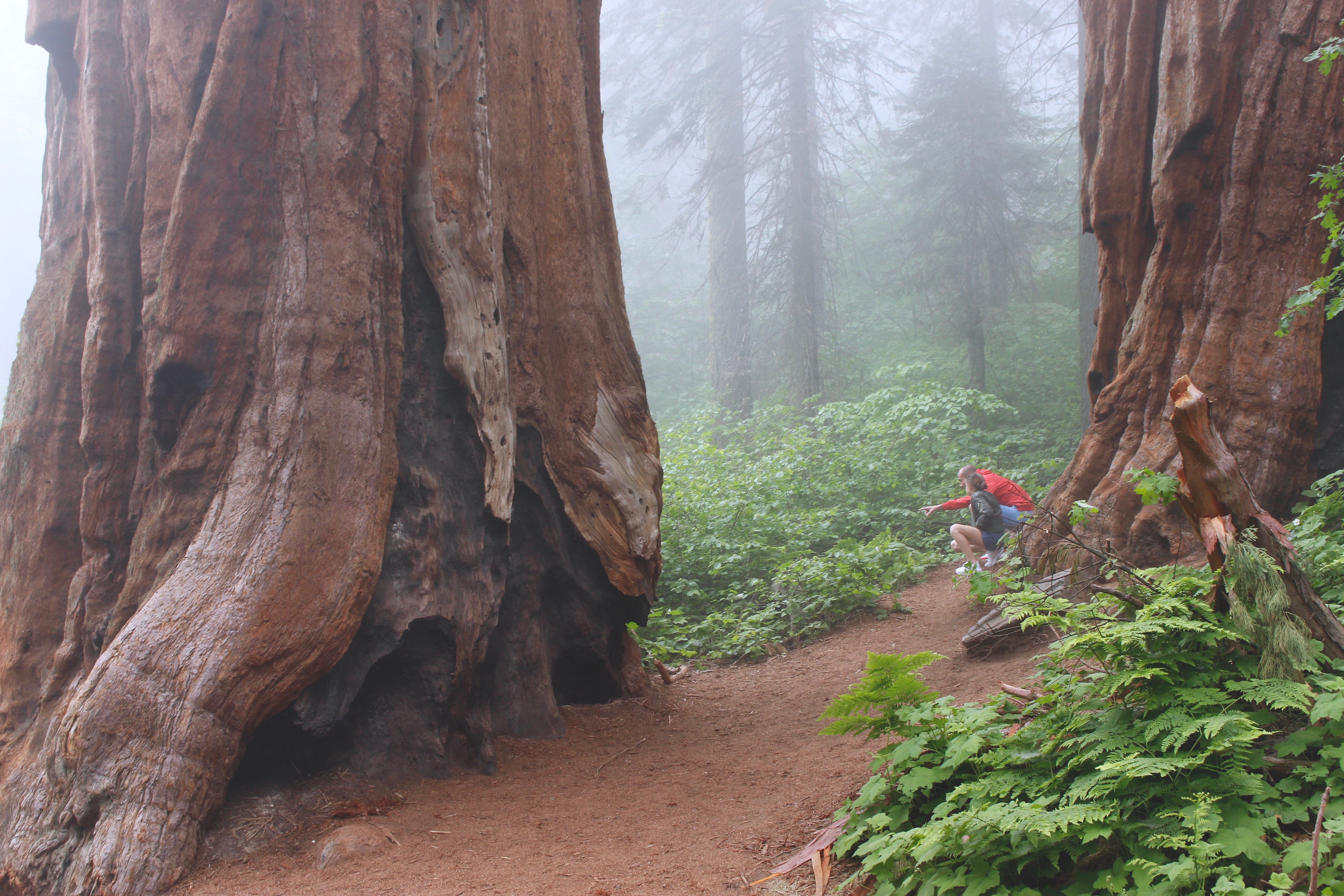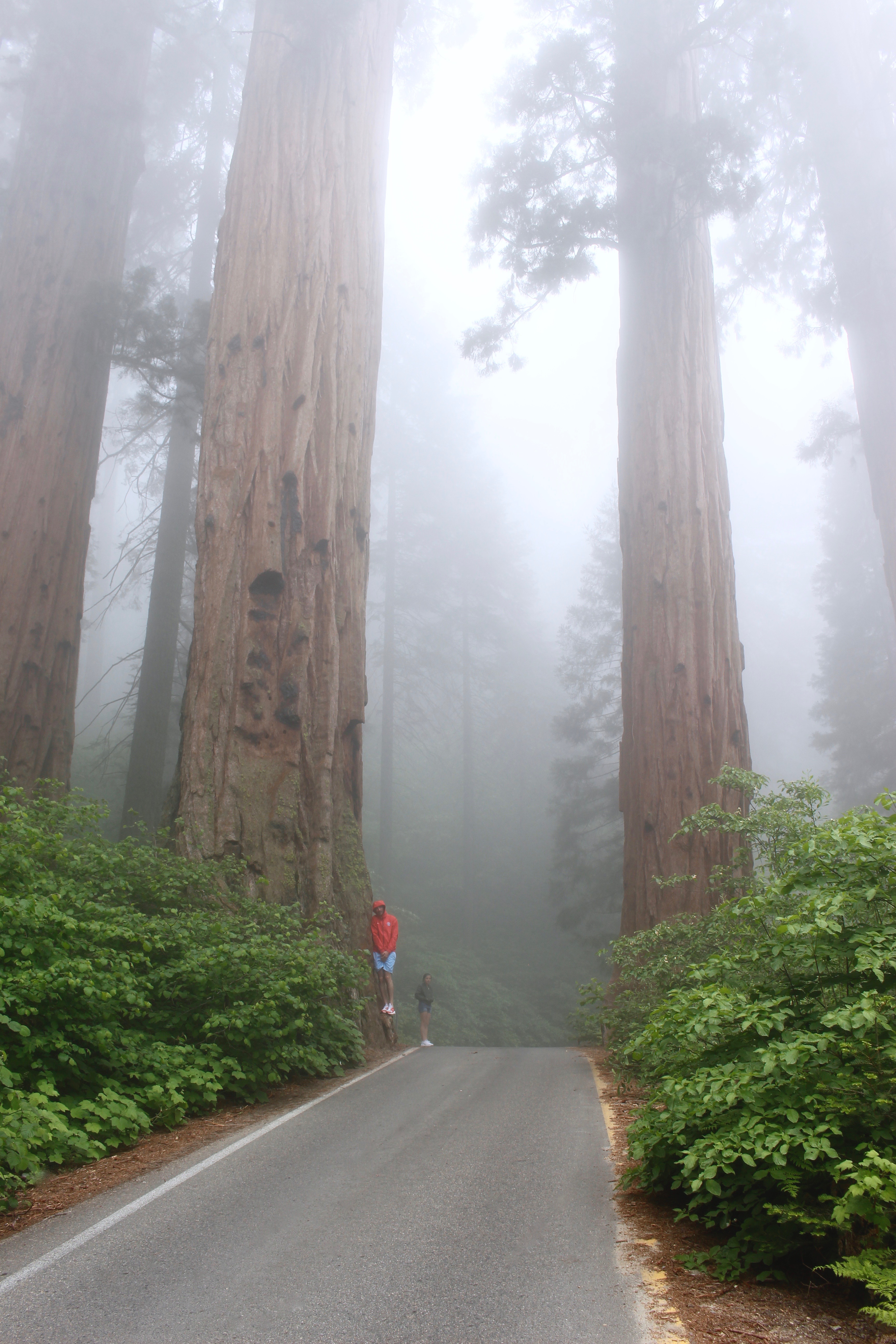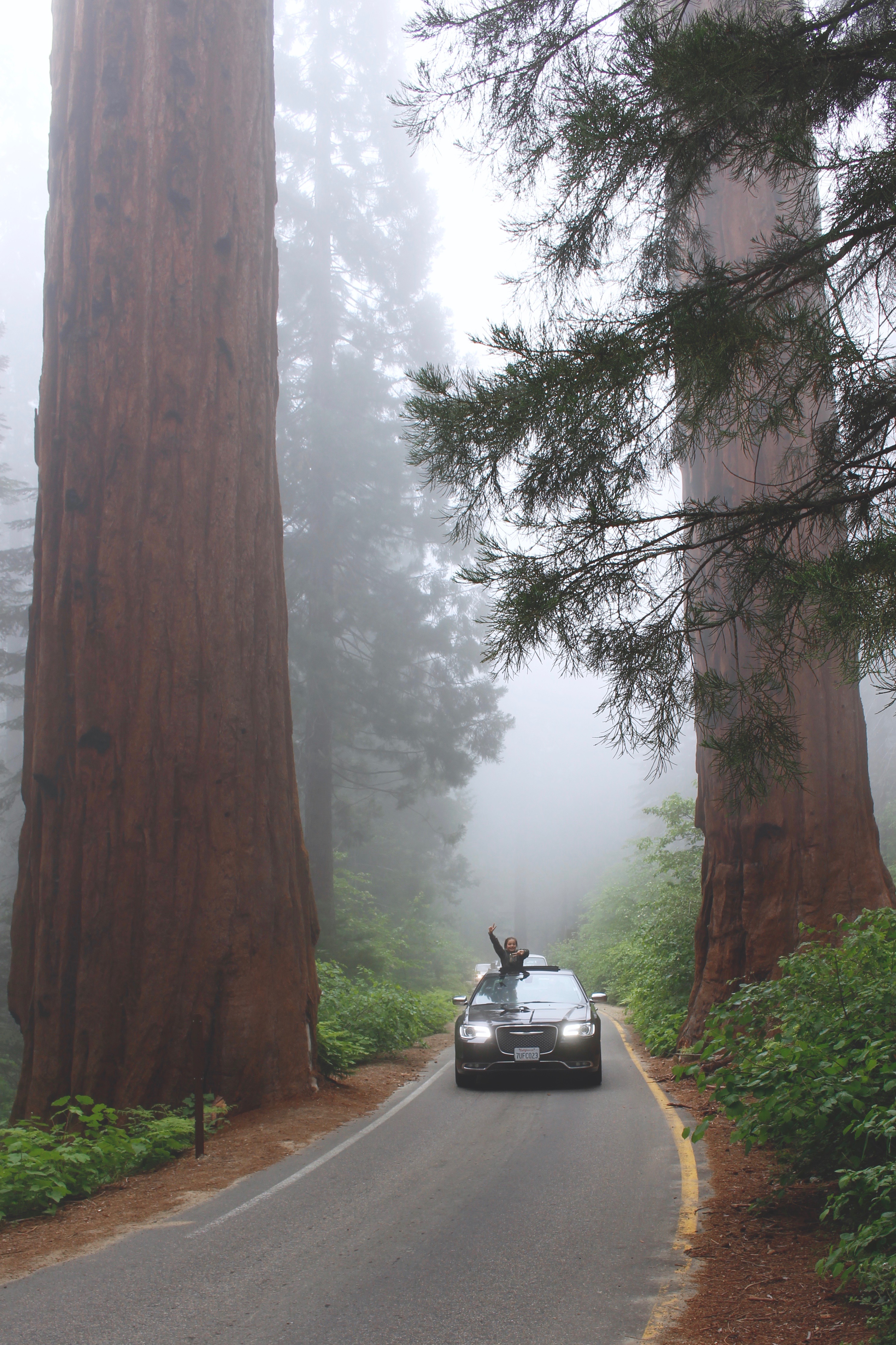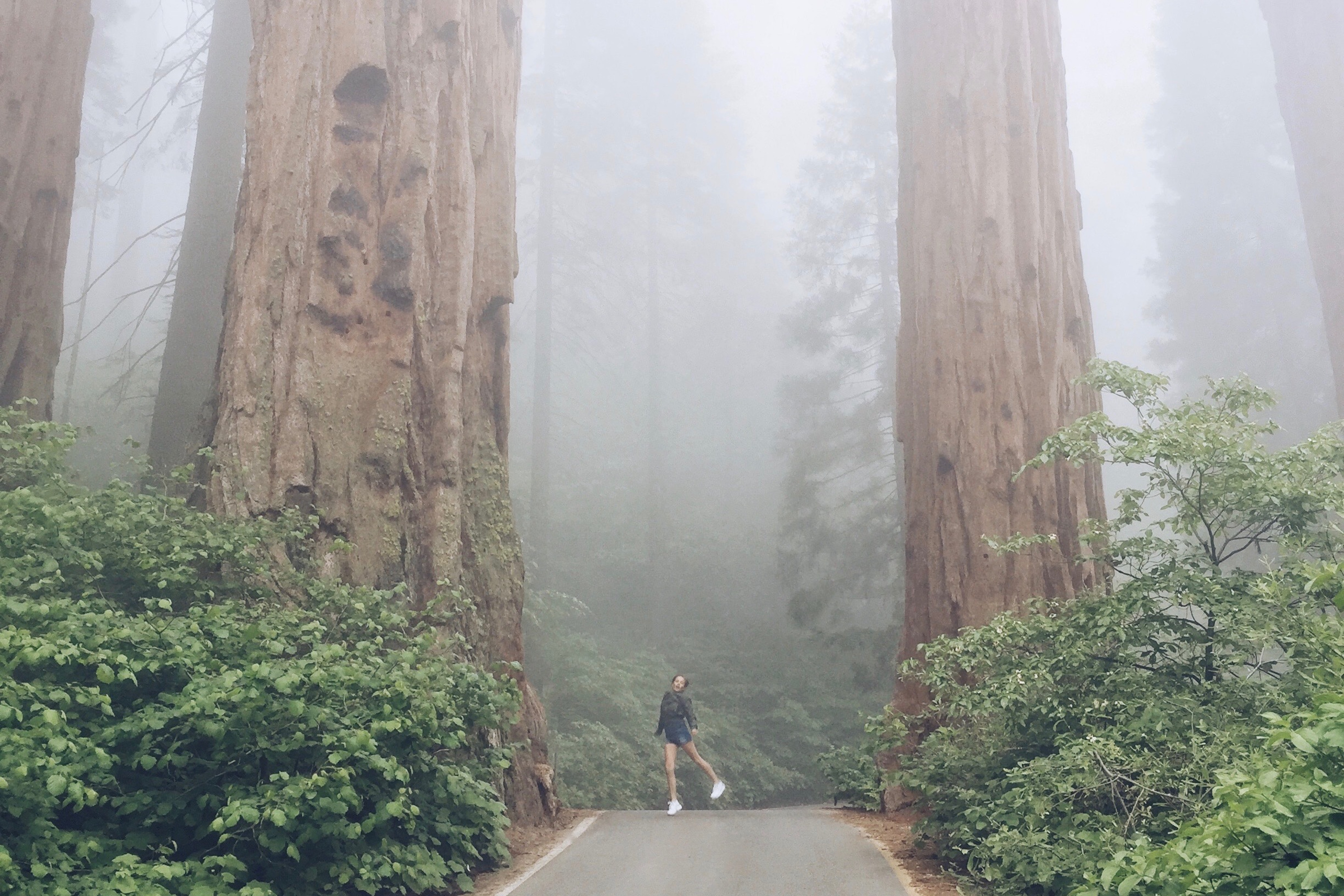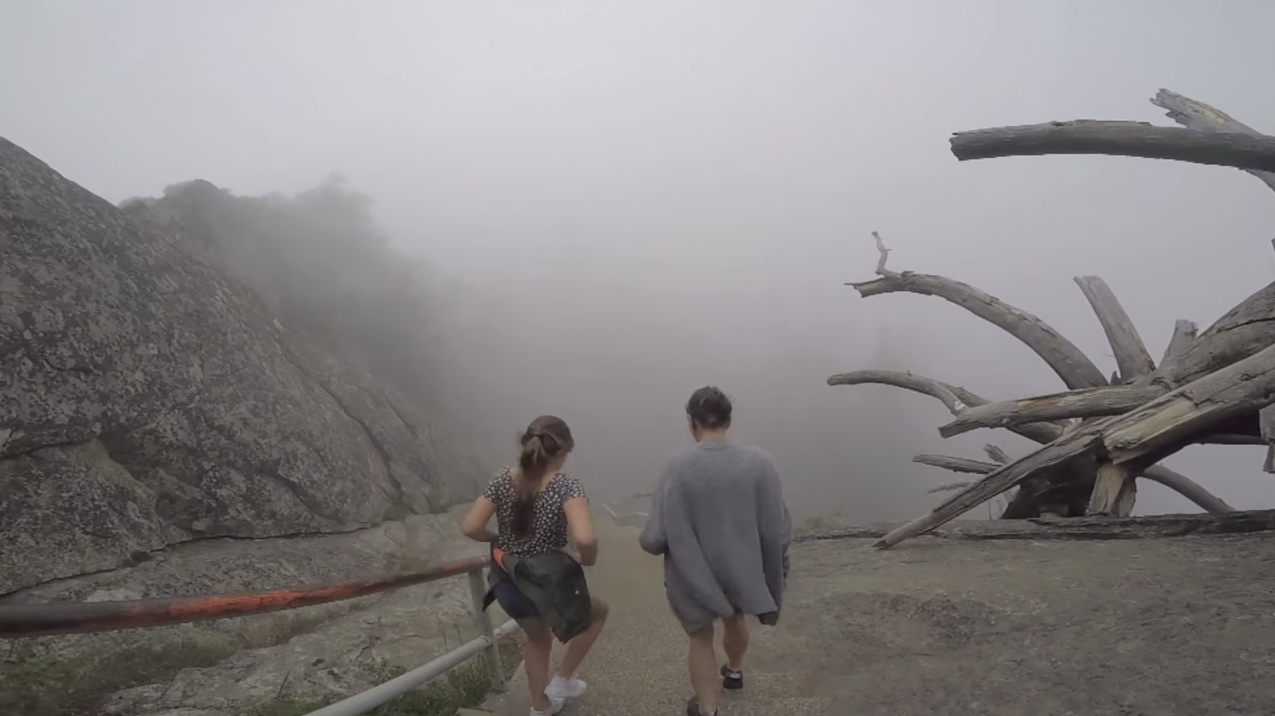 Notre premier spot sera le sommet de Moro Rock. Nous nous rendons donc vers le point de RDV du Moro Rock, car oui même si le Sequoia Park se visite en voiture, certains points ne sont accessibles uniquement en shuttle (petites navettes). Nous prenons cette fameuse petite navette et nous montons vers le Moro Rock,(comptez 15 minutes de route) en chemin nous croisons un ours, Morgan a pu profiter de la vue, alors que Laura et moi l’avons manqué ! Le chemin est vraiment beau, malgré que le temps soit toujours gris. En prenant cette route vous passerez devant l’énorme tronc de sequoia tombé il y a longtemps et dans lequel avait était taillé un tunnel afin de laisser passer les véhicules et d’en faire un attraction. Aujourd’hui l’état de l’arbre ne permet plus de passer en dessous en voiture mais vous y verrez sans doute des personnes s’y arrêter pour prendre des photos ! Nous arrivons au Moro Rock, la brume est toujours plus dense. Nous commençons à monter les marches et avec Laura nous décidons de les compter (l’idée est un peu stupide, mais nous ça nous a amusé) après avoir monté quelques 300 marches, Laura ne se sent pas bien, il fait très lourd à quelques mètres du sommet et nous ne profitons pas du paysage, c’est brumeux, c’est blanc, gris, on ne voit absolument rien, ni le fond, ni le haut, RIEN, pas même un arbre… On décide de faire demi-tour pour soulager notre belette qui peine à nous suivre.