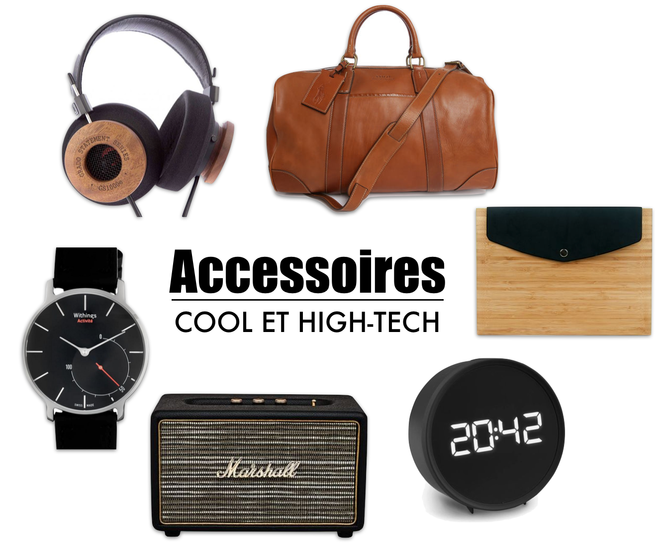 1 Sac de Voyage Ralph Lauren // 2 Pochette ipad O’FÉRÈ DESIGN // 3 un Super reveil ADDEX // 4 Enceinte Marshall // 5 Montre Withings // 6 Casque Grado