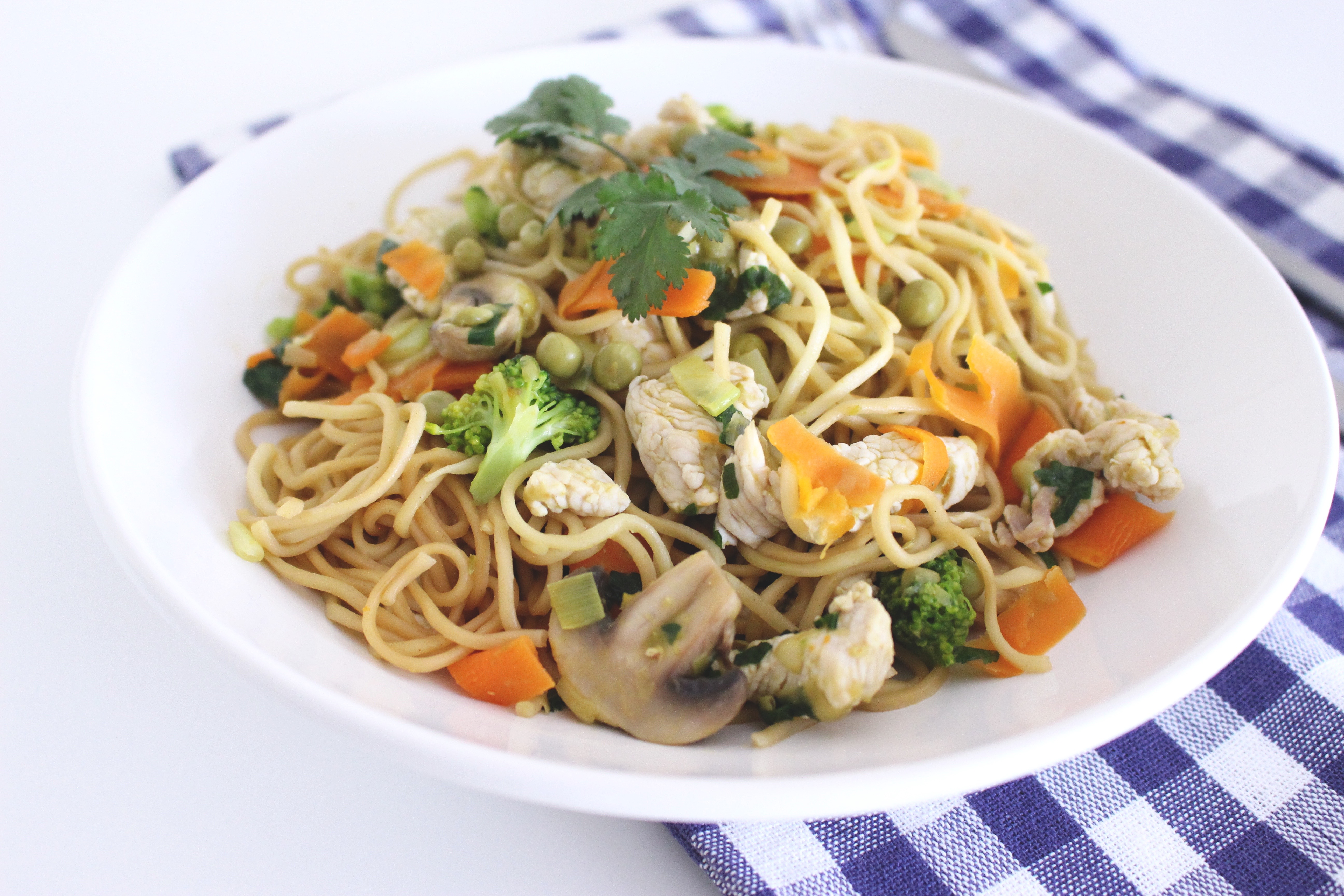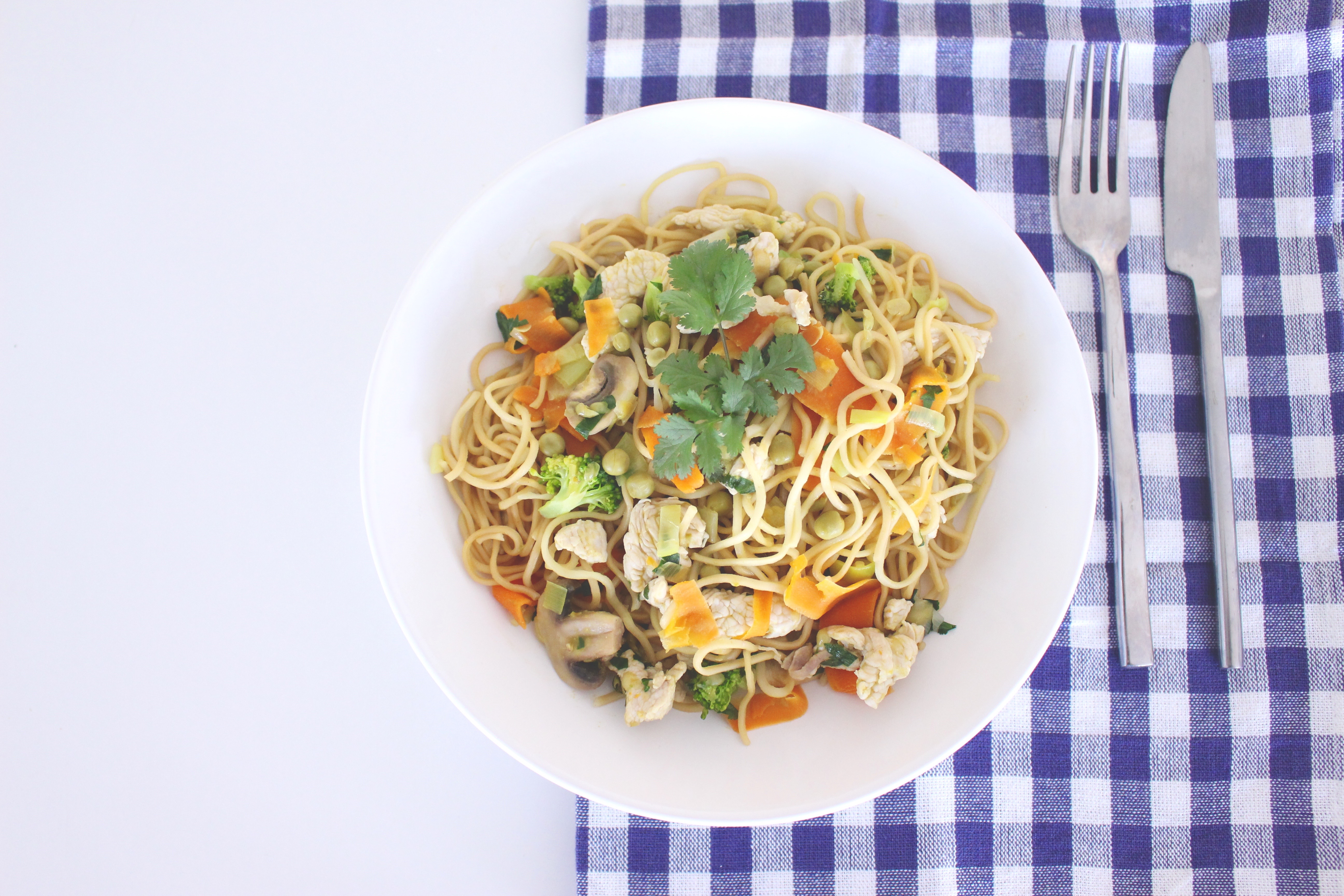 Dans un wok ou dans une sauteuse, faire revenir l’oignon avec 2 cas d’huile, ajouter les légumes un par un (je les ai épluché puis coupé avec un économe), ajouter un peu d’eau, saler, poivrer, ajouter deux cas de gelée de piment, ajouter ensuite la viande. Faire revenir pendant 5/7 minutes, il faut que les légumes soient cuit mais qu’ils reste croquants puis ajouter le persil et la coriandre. Il ne reste plus qu’à ajouter les nouilles aux mélanges. Bien mélanger et déguster!
